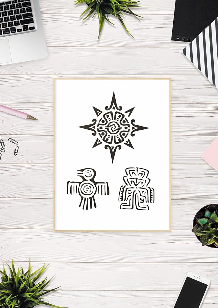 Dive into the rich tapestry of Mexico's ancient civilizations with our Mayan Aztec Symbol Stencil. This custom 8.5" x 11" stencil brings the intricate designs of Mexico's Mayan and Aztec heritage to your fingertips, allowing you to infuse your art and craft projects with a touch of historical depth and cultural significance. Whether you're aiming to breathe new life into your home with decor inspired by ancient symbols, personalize your wardrobe with unique cultural designs, engage in educational projects that bring history to life, or add a distinctive flair to your scrapbooking, this durable and reusable stencil is your perfect companion. Crafted from high-quality material, it is designed to withstand multiple uses, ensuring that your exploration of Mayan and Aztec cultures can continue across a wide array of projects. The stencil is easy to clean and maintain, promising a seamless transition between creative endeavors. This stencil not only serves as a versatile tool for your DIY projects but also as an educational gateway to exploring and celebrating the storied past of Mexico's ancient civilizations. Suitable for a variety of mediums and surfaces, it invites you to create, learn, and share the beauty of Mayan and Aztec heritage through your unique creations. Embrace the spirit of Mexico's ancient civilizations with our Mayan Aztec Symbol Stencil, and let your creativity soar on the wings of history. It's not just a crafting tool; it's an invitation to connect with the past, inspire the present, and create lasting memories through the power of artistic expression.
