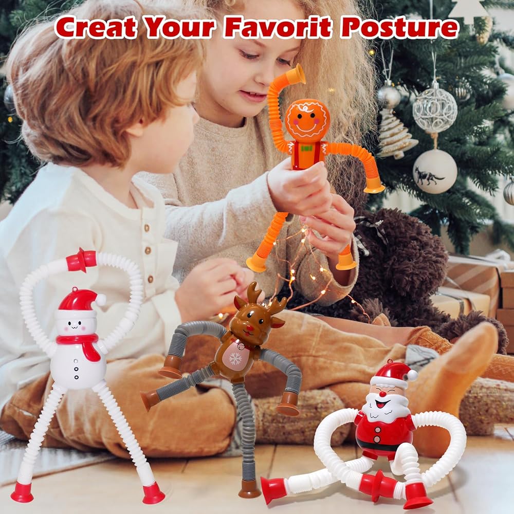 👼✨ 【FUN SENSORY TOYS FOR KIDS】: These brightly colored Halloween Christmas pop tube Toys offer more than meets the eye. With pop tube arms and legs featuring uneven textures and satisfying popping sounds, they engage kids' senses and promote motor skill development. The added telescopic suction cup limbs enable them to attach to flat surfaces like windows or desks, introducing a new dimension of play and tactile sensation.