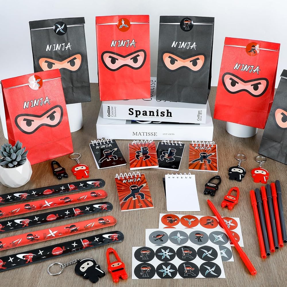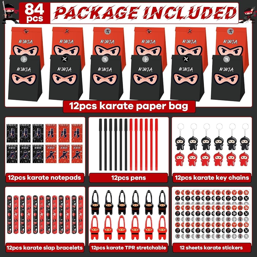 Karate party gifts set: 12pcs colorful karate paper bag, 12pcs colorful karate notepads, 12pcs pens, 12pcs colorful karate key chains, 12pcs colorful karate slap bracelets, 12pcs colorful karate TPR stretchy flying toys, 12 sheets karate stickers(288pcs in total)are included. The abundant kits and rich styles will satisfy your various needs and replacements.