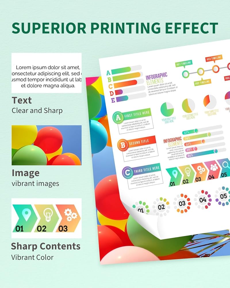 【Excellent Performance】Ink droplet particles reach standard fineness, smooth and even ink output, more stable printing, clear and true colors. They are ideal for printing high quality documents and your wonderful photographs.