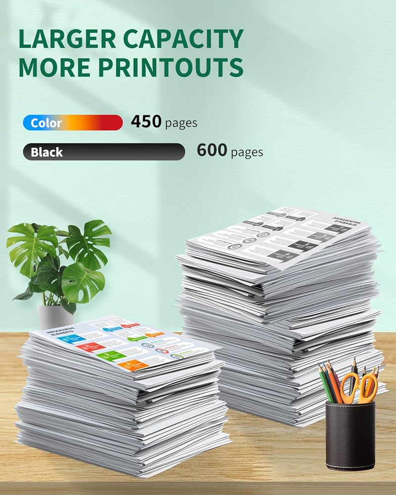 【Extra large capacity】: Get up to 500 pages per T410xl black ink cartridge, 650 pages per T410xl color ink cartridges, 650 pages per T410xl photo black ink cartridge, based on ISO/IEC standard with 5% coverage.