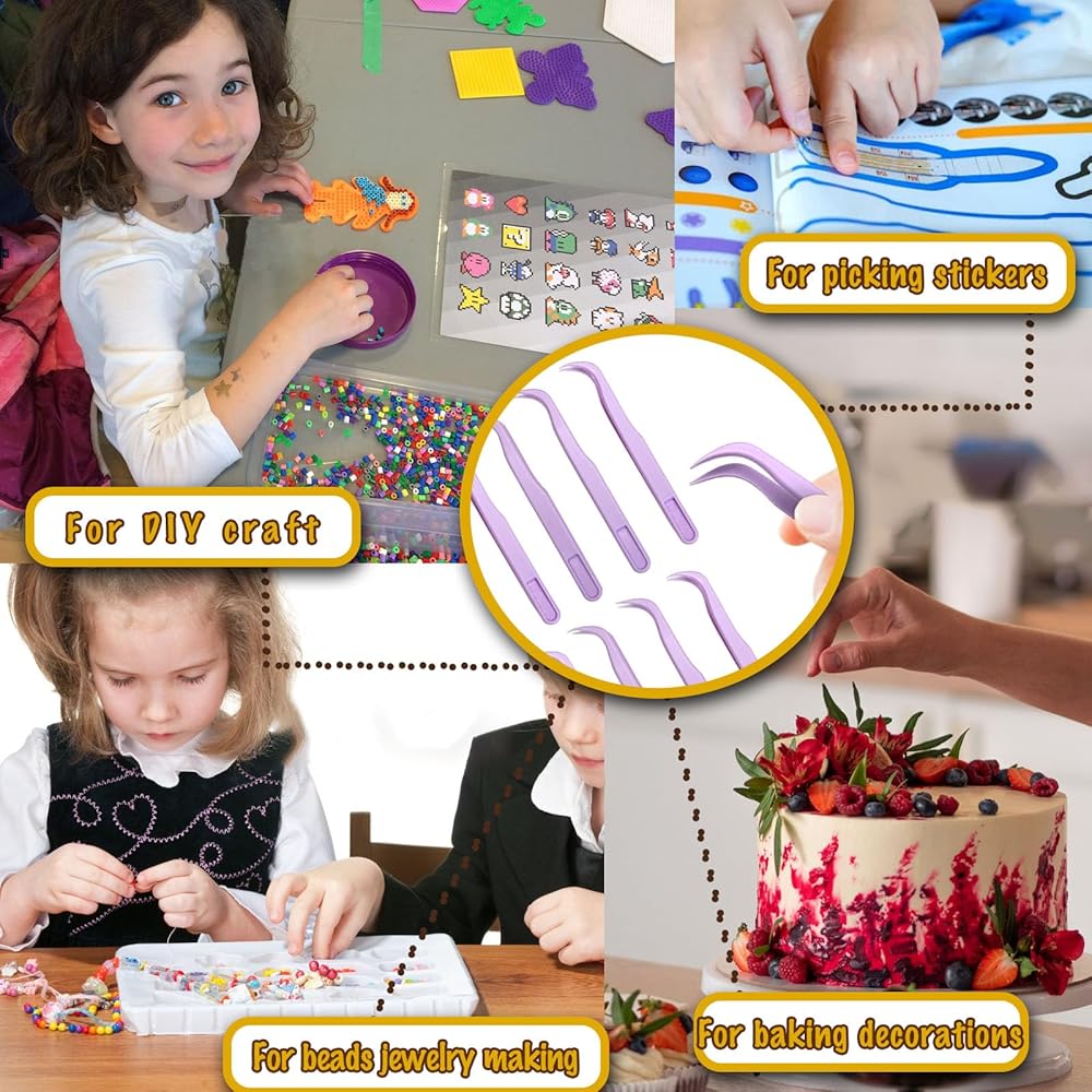 • Plastic Tweezers: This pack of 12 long bent plastic tweezers, each 4.5 inches long, is perfect for kids crafts, DIY jewelry making, bead bracelets, sticker application, feeding reptiles and baking decoration for adults. These tweezers can handle a variety of tasks.