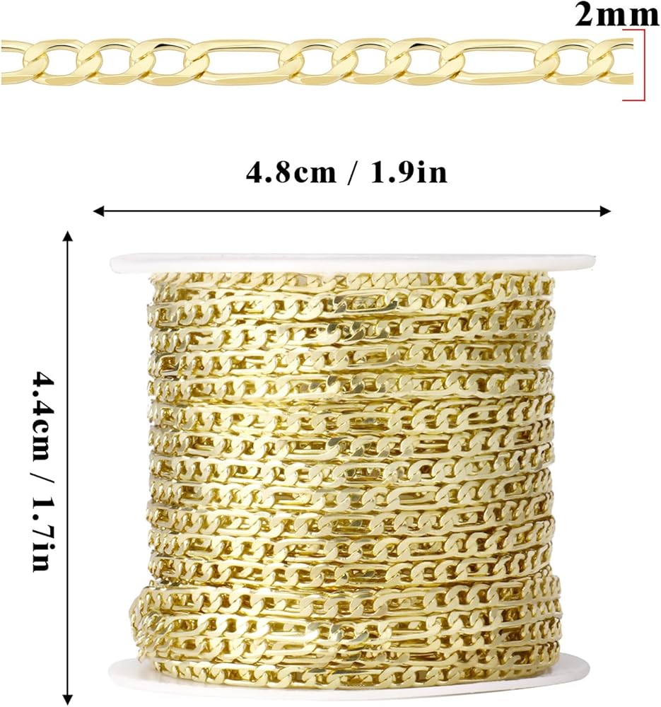 [33 FT] Gold Figaro Chains Roll, 2mm Wide 14K Gold Plated Brass Figaro Link Chain Roll Bulk for Jewelry Making