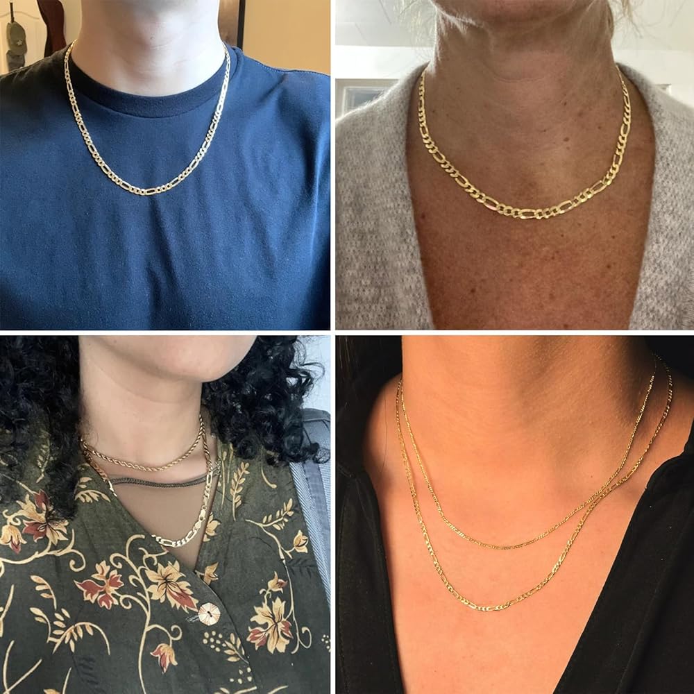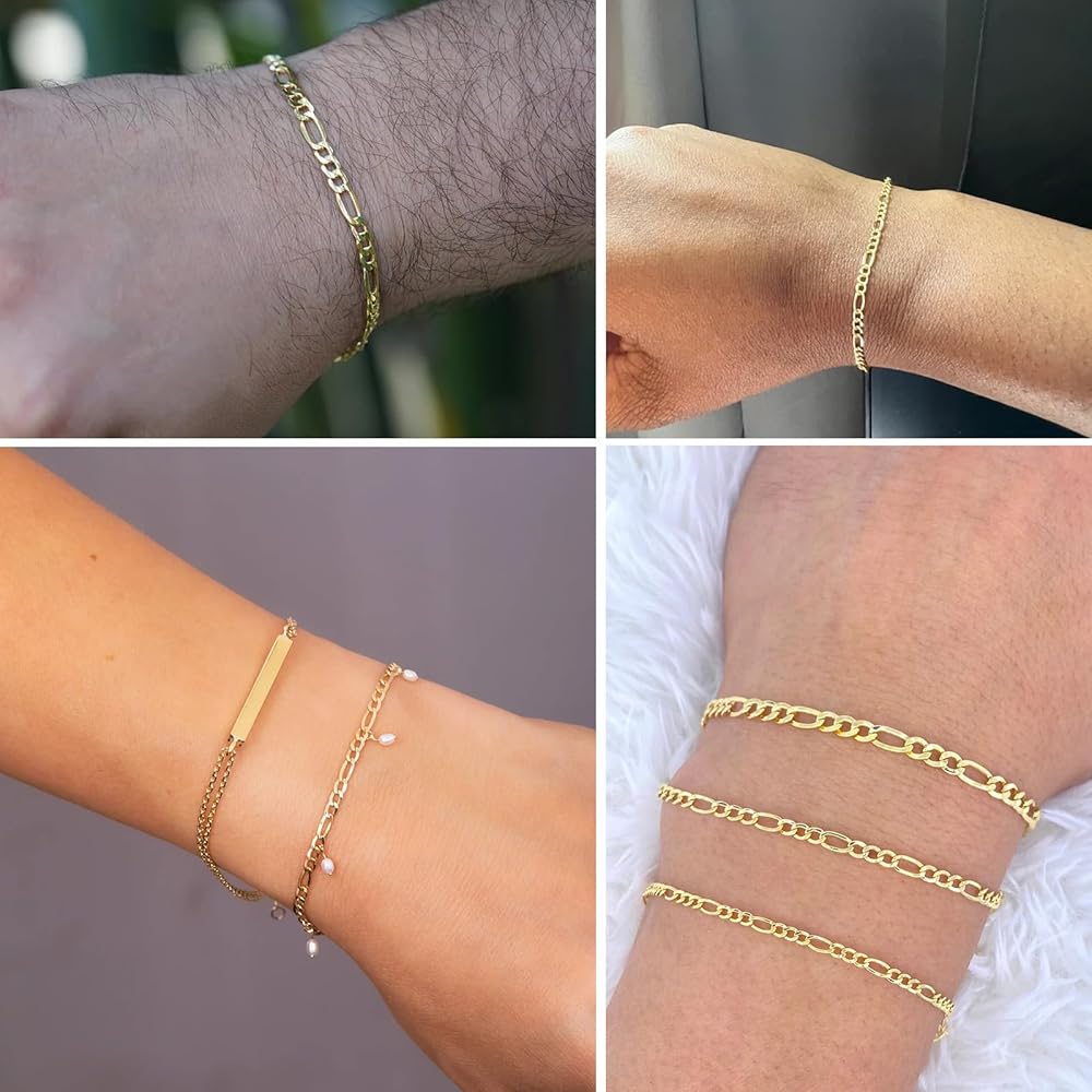 Material: 14K gold plated brass figaro chains. They are durable, hypo allergenic and resist tarnishing.