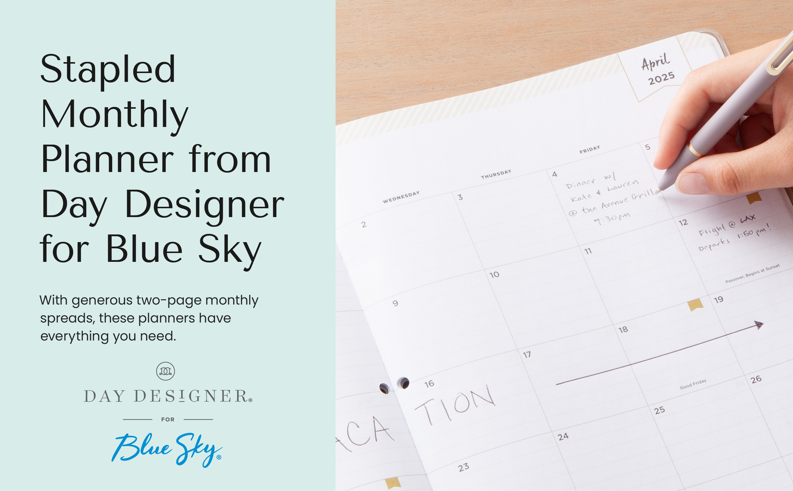 Monthly calendar view per two-page spread offers a visual overview of your time for long-term planning, reference calendars and a notes section for important projects and reminders