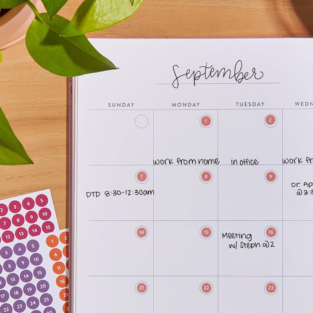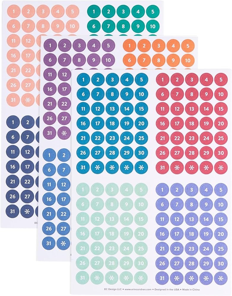 The Erin Condren Date Dots Calendar Stickers add a touch of color to your planner and calendar. Designed for undated planners, calendars, and agendas, these stickers fit both large and small planners. Each sticker sheet measures 4.25” x 6” and includes 12 months of stickers, providing a full year's worth of date dots. These stickers match Erin Condren's classic monthly sticker books for cohesive color harmony. Each individual sticker measures ¼” in diameter, making them versatile for various uses. The pack includes three sticker sheets, offering ample stickers to stay organized. Useful for adding a calendar function to any notebook or journal, these date dots enhance your planning routine. Founded in 2005, Erin Condren is a leading lifestyle brand offering fun and functional organizational tools for the home, office, classroom, and more. From planners, calendars, notebooks, desk accessories, and bags, each product is designed in the USA. The female-led, diverse Erin Condren team enjoys creating productivity tools to help customers turn their dreams into plans and their plans into reality, leading to meaningful, fulfilling lives through organization.