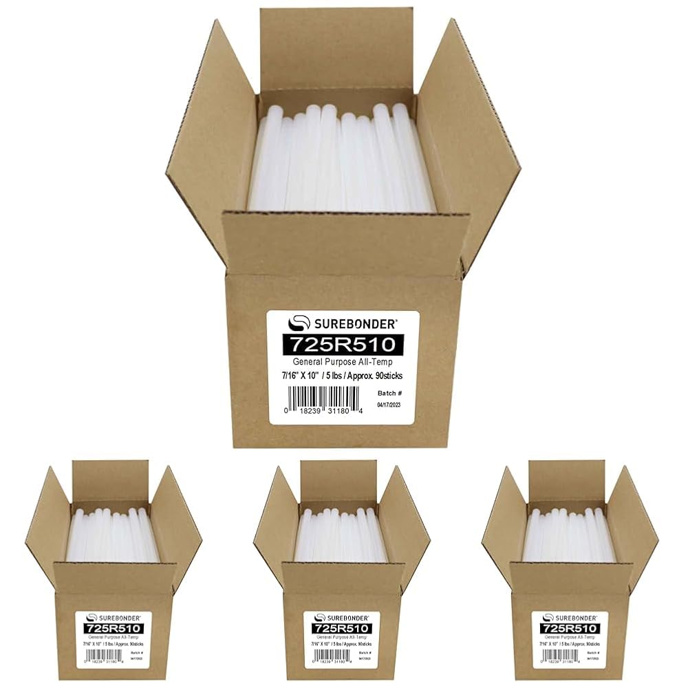 Surebonder 725R510 10-Inch All Temperature Glue Sticks Highlights: Size: 10" x 7/16" diameter; 5 lb. box (approximately 90 glue sticks); All temperature; Hot melt adhesive to be applied in either low, high or dual temperature glue guns; Bonds to porous and non-porous material; Boxed; Approx. 90 glue sticks.