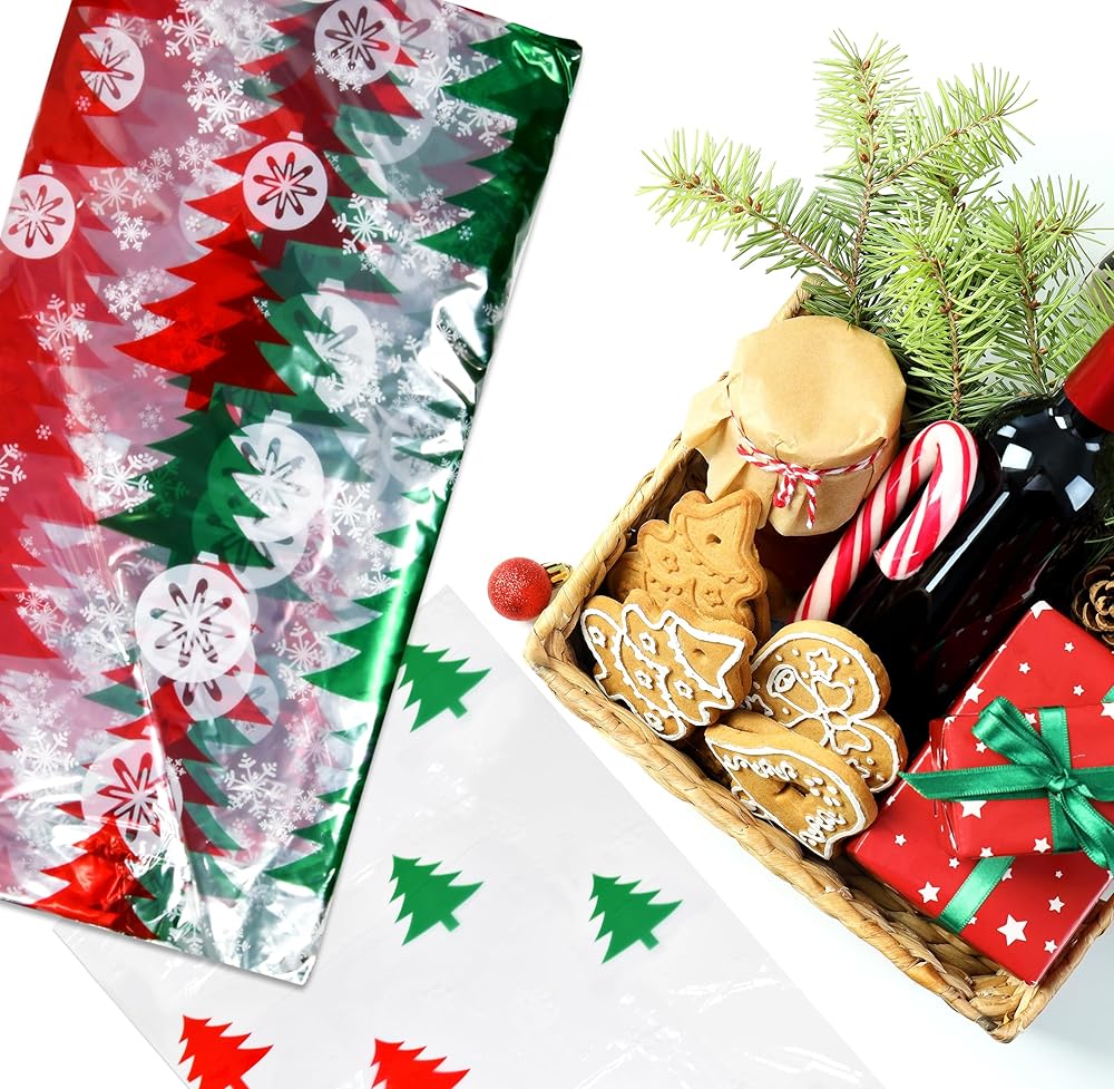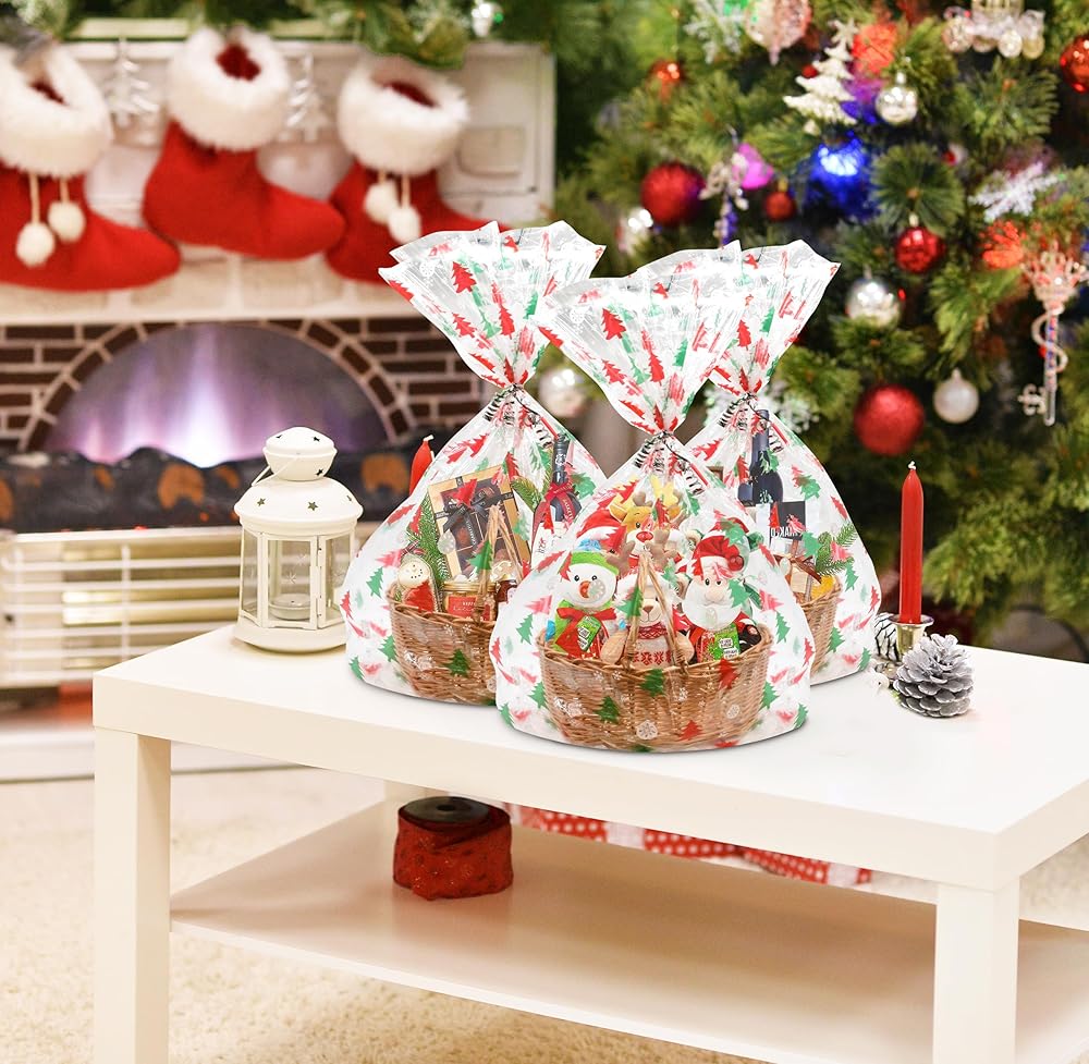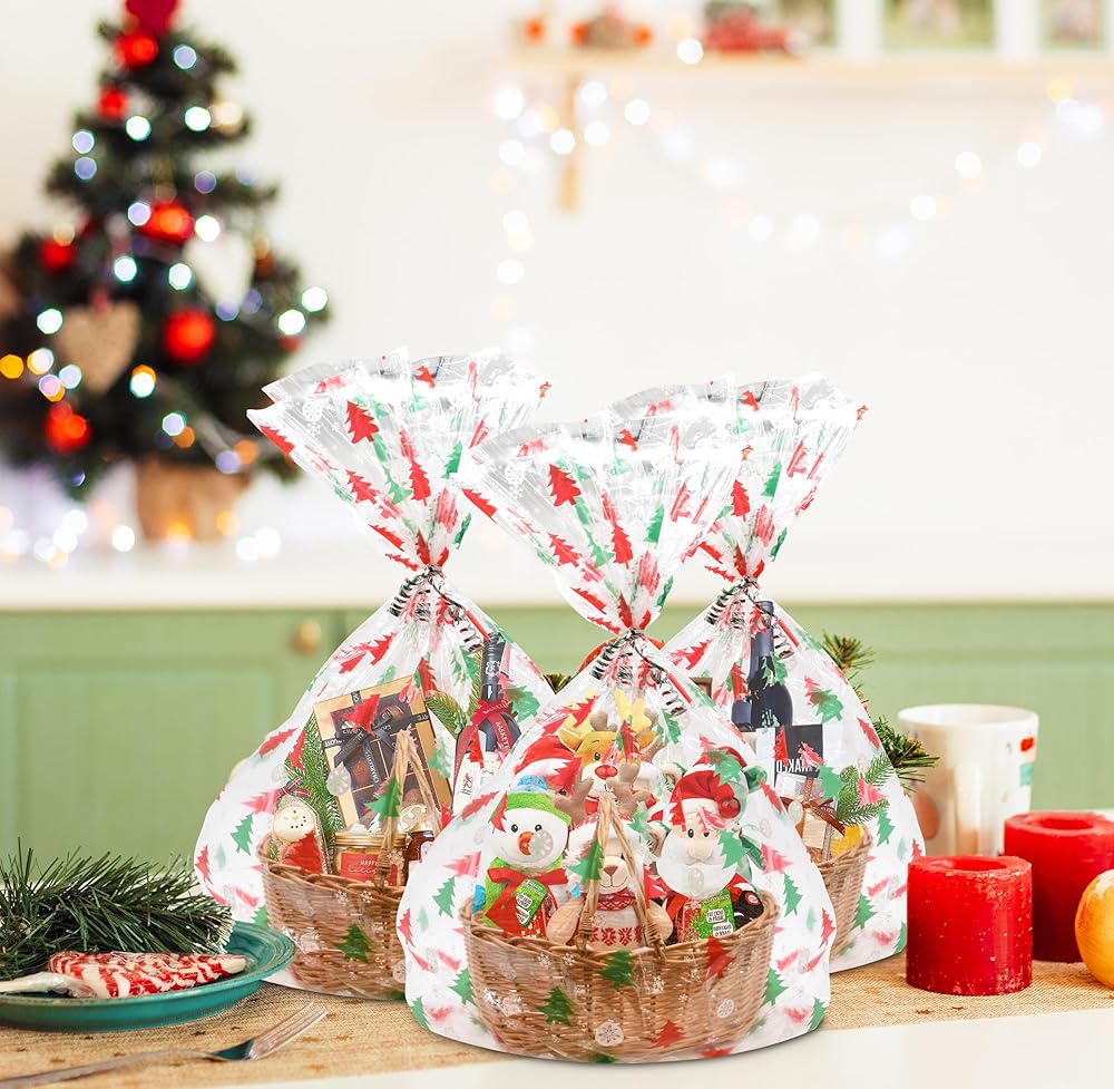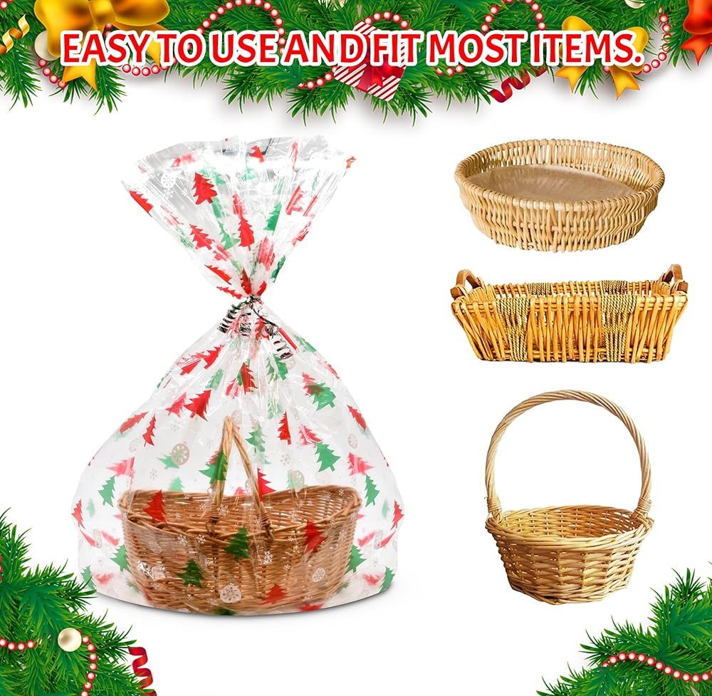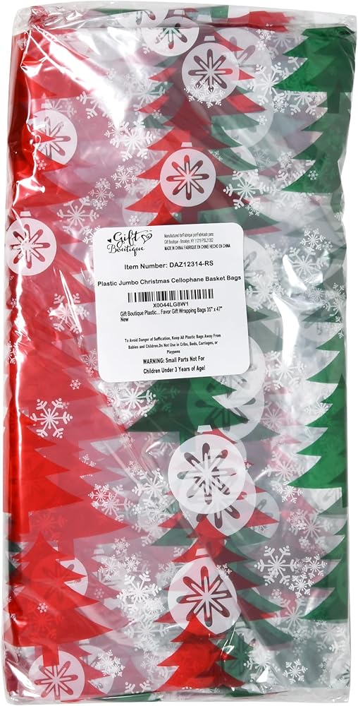 Extra Large Size Christmas Gift Bags: You will get a set of 12 of 35"x47" clear cellophane bags with printed design and gold twist ties. The extra large size made clear bags can easily fit the basket and gift well. You can embellish bags with ribbons, making your gift more beautiful. Includes 1 design featured red & green Christmas trees with white ornaments. Multiple Use: The goodie bags also look beautiful when they have items displayed inside. So it is suitable for wrapping candies, cookies, treats, wine, baskets cosmetics, store garments, stuffed toys, bedding, daily necessities, and so on. Durable and Thick: The Christmas gift bags are made of high-quality materials, with a thickness of mils, and are sturdy and durable. They're of excellent quality and you don't have to worry about them ripping and crinkling easily when you carry them around. Easy to Use; The large Christmas cellophane treat bags are easy to use and fit most items. Just put your basket or items into cellophane bags then tie a big bow and ribbon. Unlike cellophane rolls, clear cellophane bags don't require tools to cut off the bags. Great Gift Warp: You can use these cellophane wraps for Christmas gifts to make wonderful gifts for your friends, family, and coworkers for parties, and holidays, or any other special occasions.