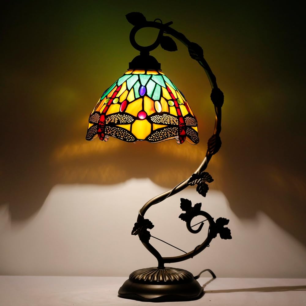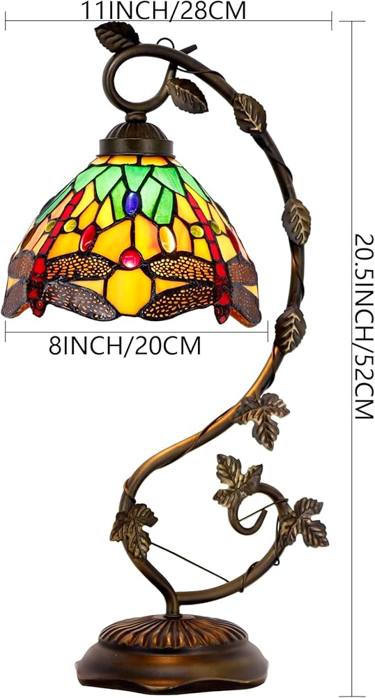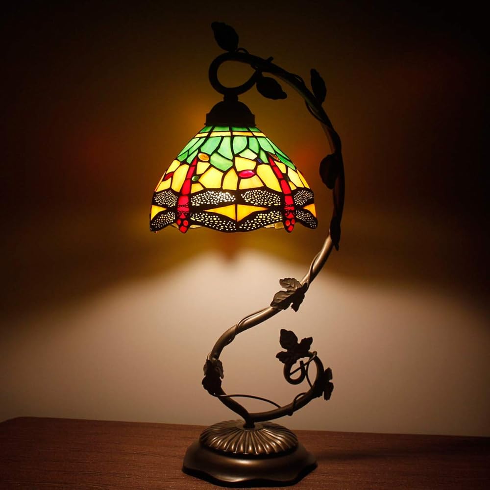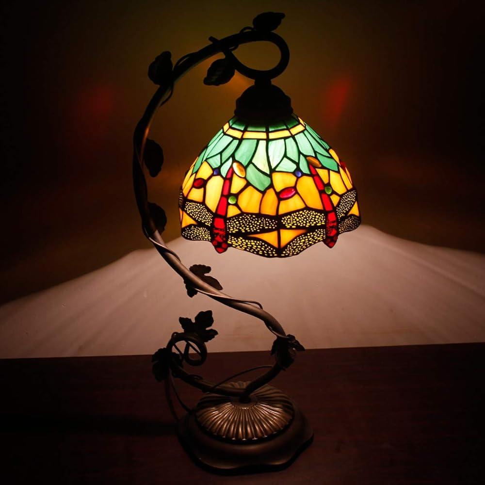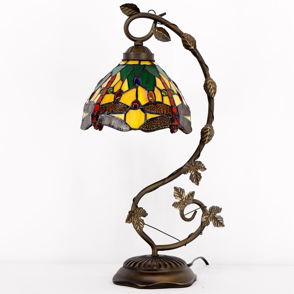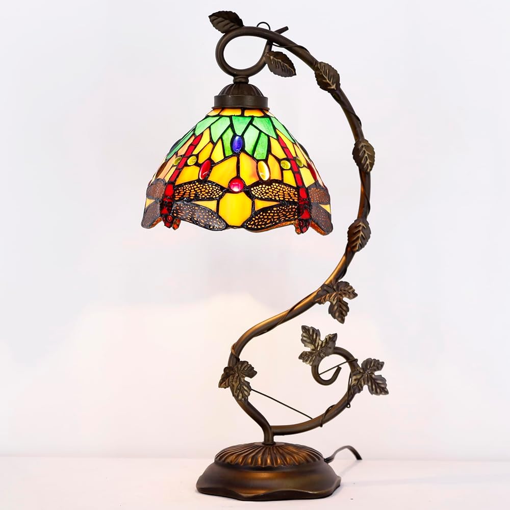WERFACTORY Tiffany Lamp Green Yellow Stained Glass Dragonfly Style Table Lamp Metal Leaf Base 8X10X21 Inches Desk Light Decor Small Space Bedroom Home Office S009G Series