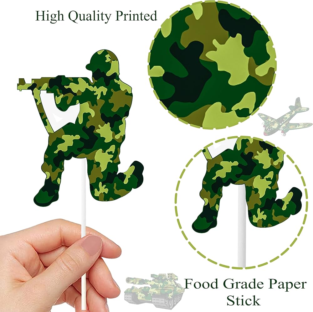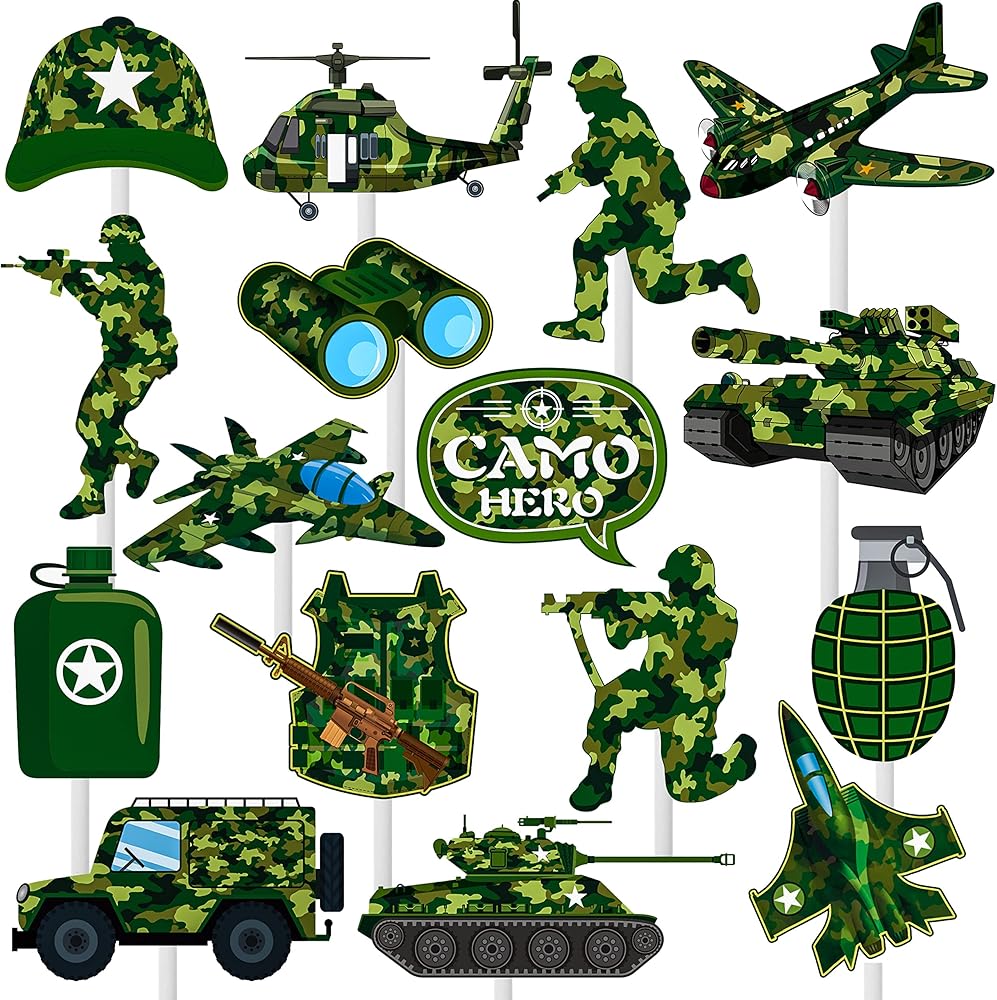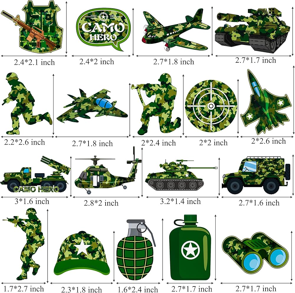 Package includes 1pcs camo cake topper and 36pcs camouflage party cupcake toppers. Classic cool camouflage theme element patterns, such as tank, soldier, helicopters, grenades, binoculars, army water bottles, etc. Let you immersed in the mysterious atmosphere of the camouflage world. Cool multi-style design to meet your various party needs, such as camo party, soldier theme party, tank theme party, military party, birthday party, baby shower and so on. Add more fun and charming atmosphere for your party.