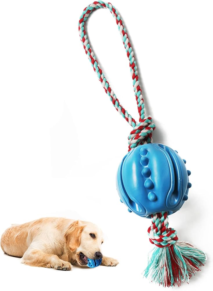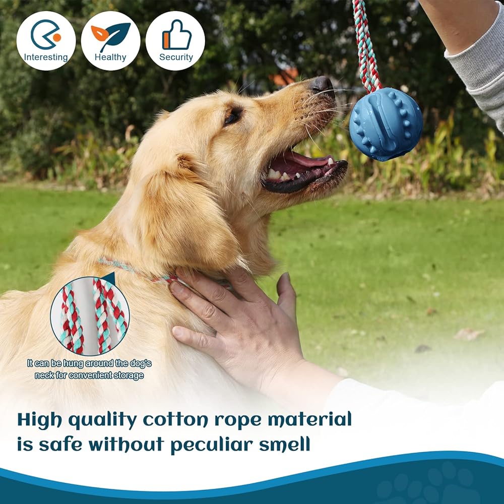 【3D Groove Design - USED TO MOTIVATE - REWARD】.The Ball on Rope Toy of the dog leash ball is designed with grooves,Ball are small bumps on the surface so that your dog can easily grab it o.you can on grooves iinsert a large bone or Stuffed with coarse ground food, peanut butter, snacks, etc, and can be more tempting, and also You can spread peanut butter or dog toothpaste on the bumpy surface to help dogs clean teeth, reduce plaque build-up and improve dental health.