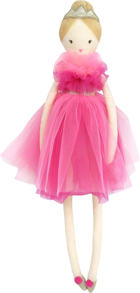 SOFT PLUSH DOLL - Our Princess Sophia in hot pink rules any playroom with her statement-making style. Dressed to impress in a frothy fuchsia tulle dress and pink pom-pom slippers with a gold crown perched in her sleek chignon, our princess doll is ready for hours of imaginative play.