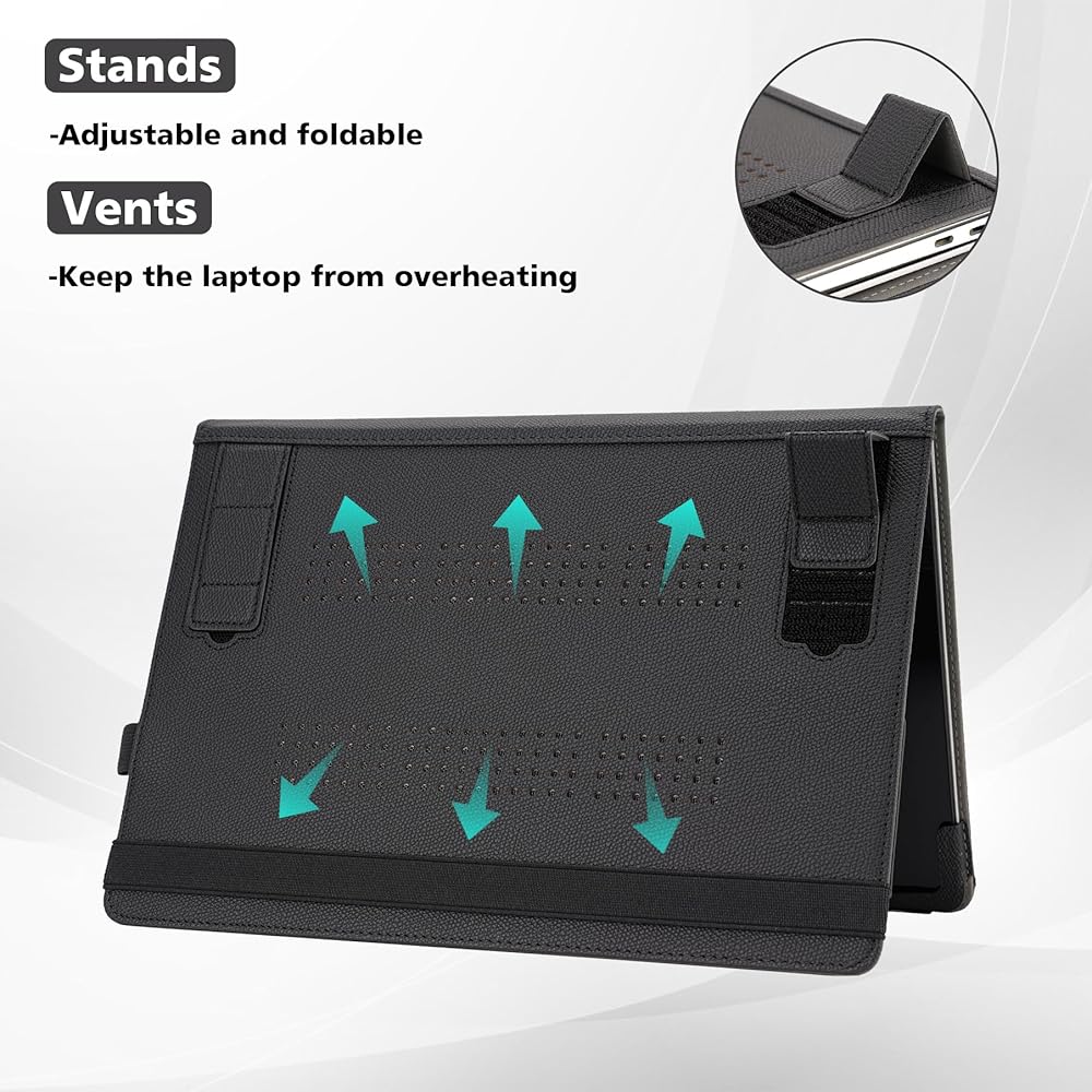 [Stand and Vents] The laptop cover has an adjustable and foldable stand function that providing a more comfortable working experience. Also there are vents on the bottom offering good ventilation and protecting the laptop from overheating
