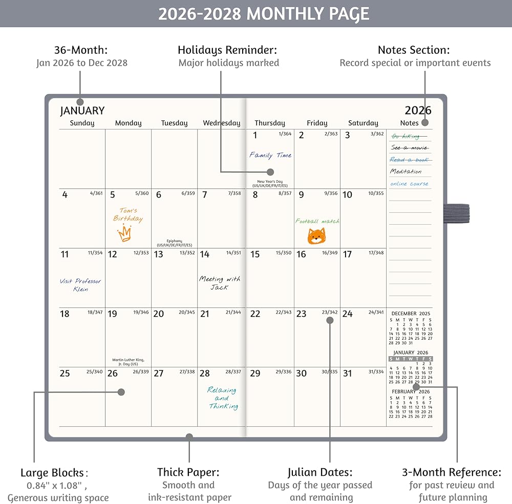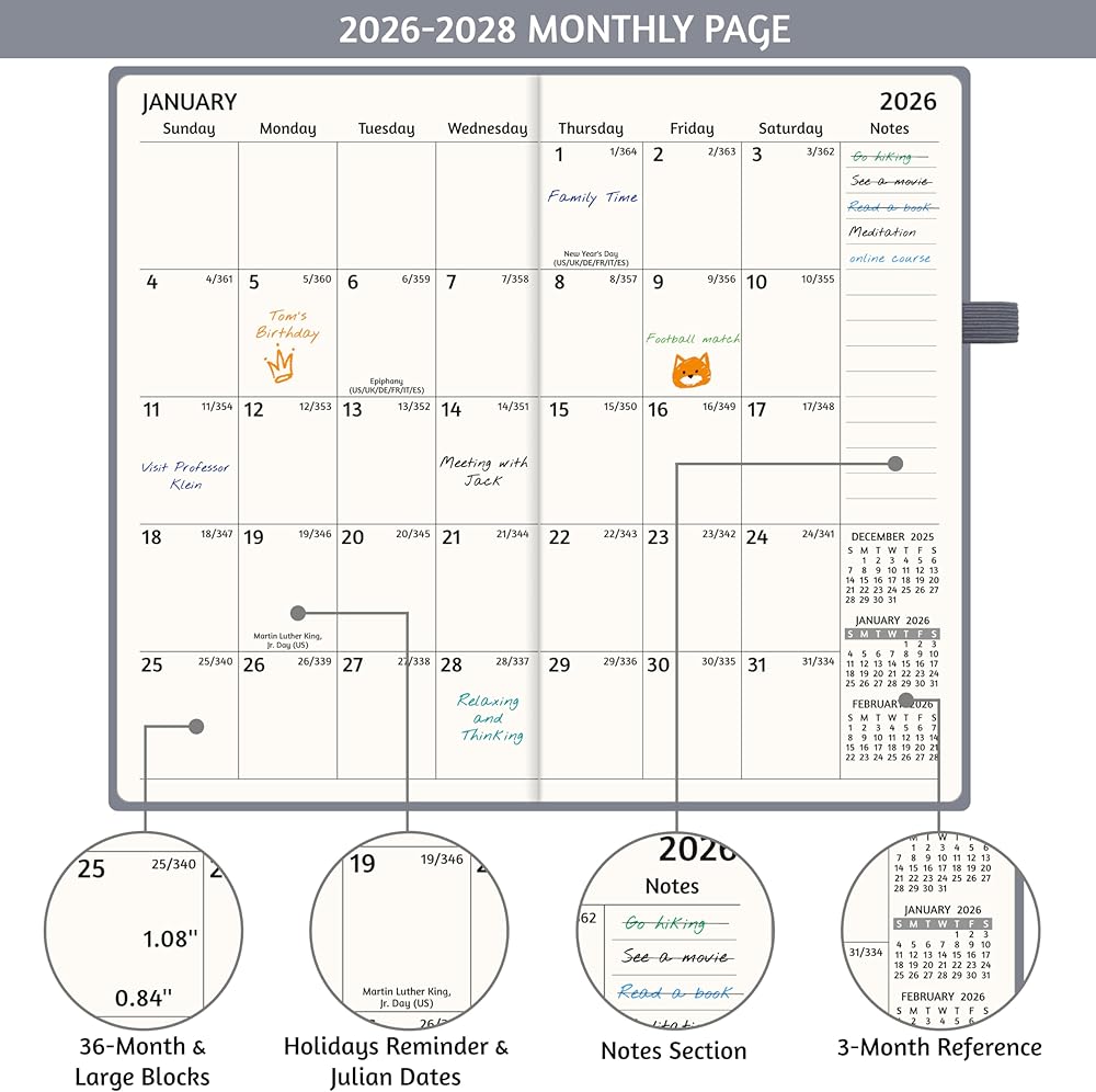 ✅ MONTHLY OVERVIEW - 2-page-a-month spread with unruled blocks and notes section gives enough space to write in your appointments, activities, ideas, etc. Holidays, Julian Dates, past, current and next month reference are included.
