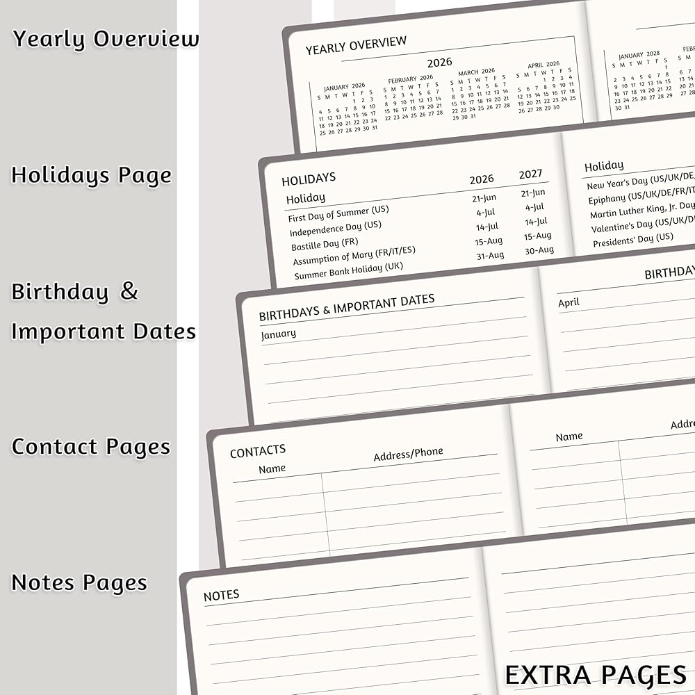 ✅ ADDITIONAL PAGES - Includes 2025-2028 yearly overview & Holidays, Important dates pages, Contacts pages and Notes pages for extra recording.