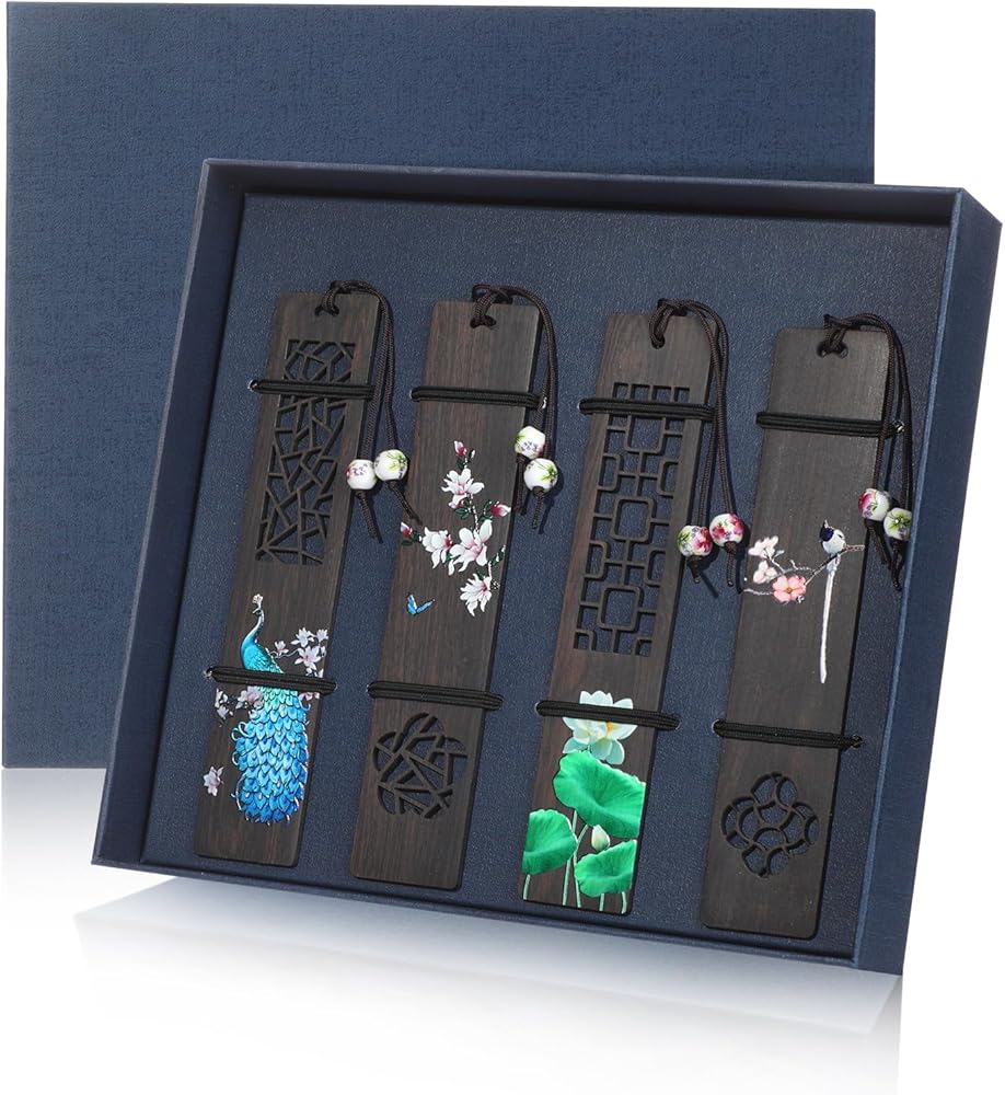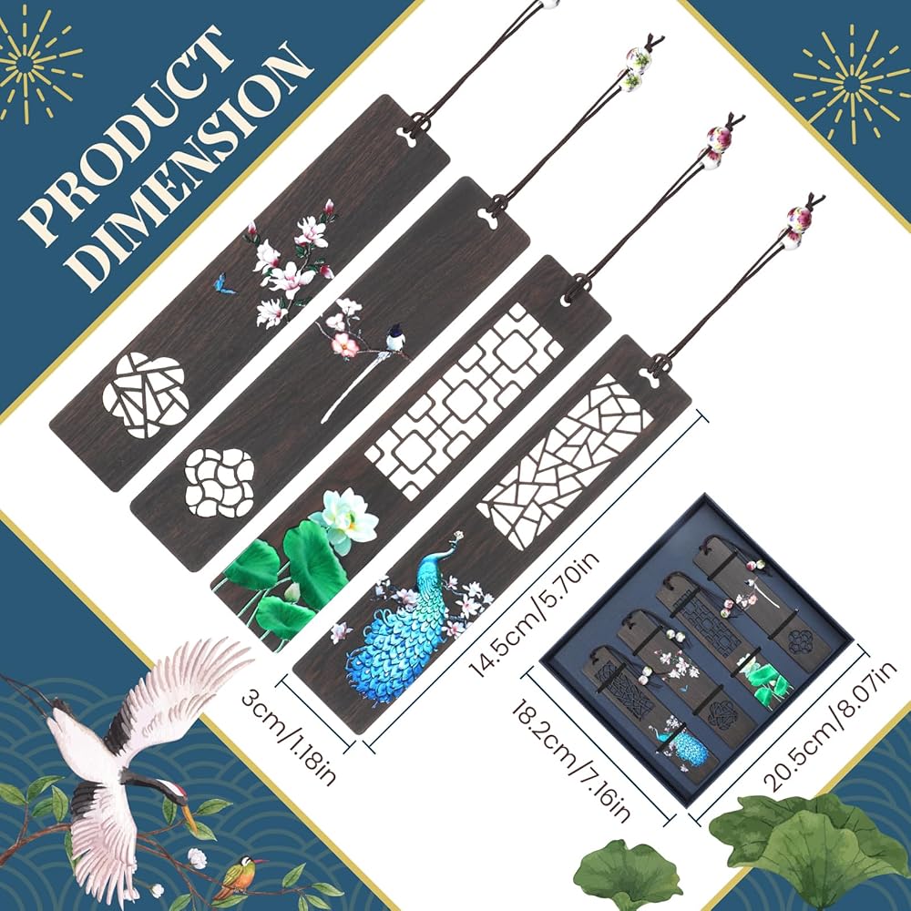 4 Pieces Wooden Bookmark for Book Lovers, Handmade Hallow Out Natural Wooden Carving Bookmark Box Set, Peacock and Lotus Pattern Painted Bookmark for Women Men Teacher Birthday Gift
