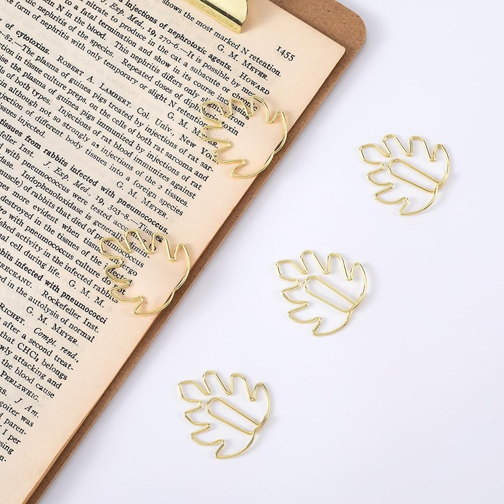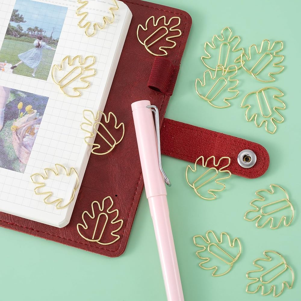 HINZIC 20 Pack Paperclip Bookmarks, Cute Leaf Shape Monstera Paper Clips Page Markers for Notebooks Scrapbooks File Organizer- Gold