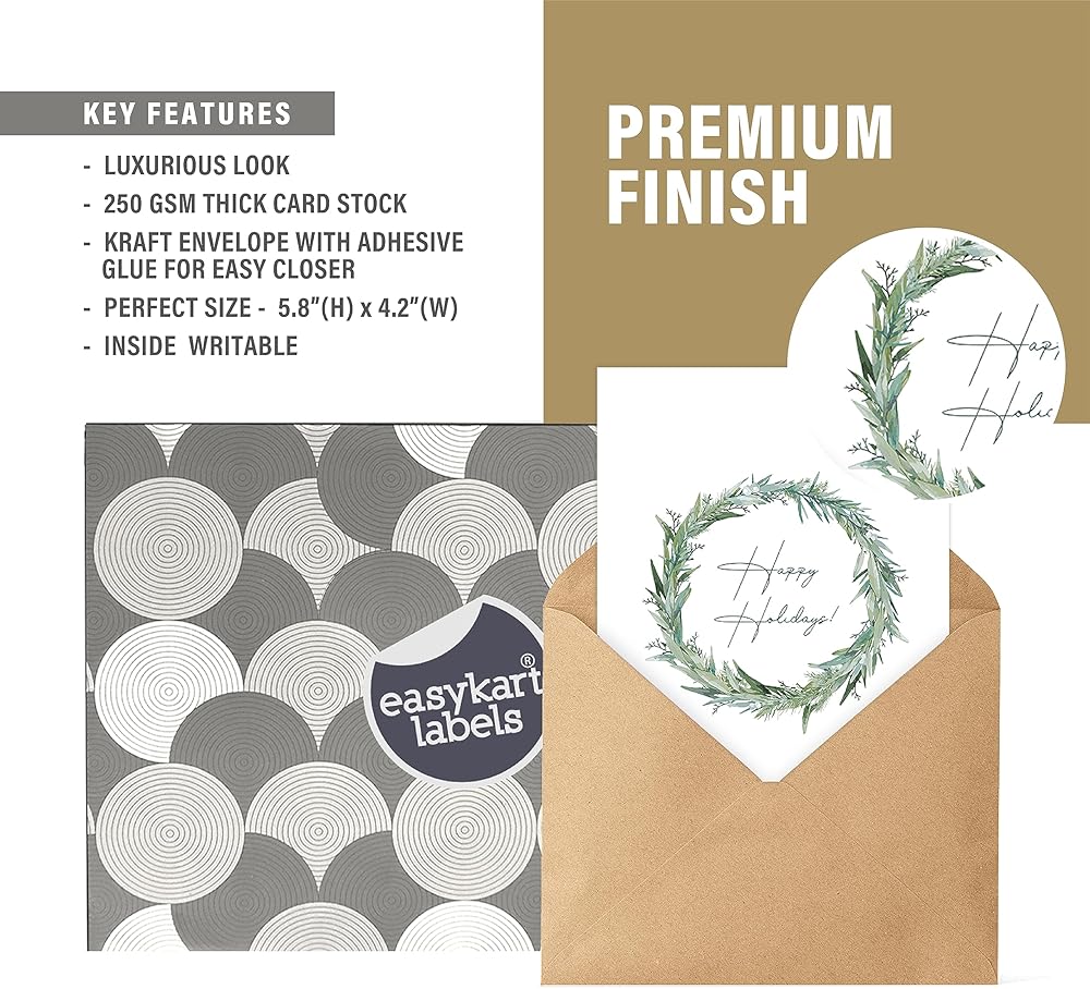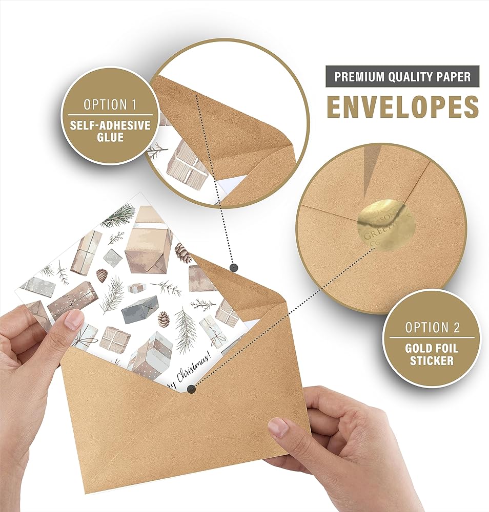 PREMIUM & THICK CARDSTOCK – These Gold Foiled Christmas greeting cards are printed on high quality 5.5" x 4" (when folded) cardstock with white mailing envelopes. Our top notch printing technology leaves crisp, clear colors without smudged lines or fades. Each envelope with adhesive glue for easy closure & also it comes with an additional 24 pcs sealing stickers in gold foil “Seasons Greetings”.