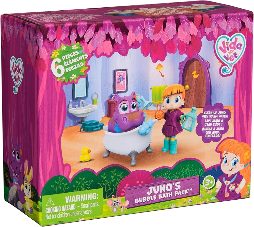 Create thrilling vet-play adventures in Sweetwood, full of caring and healing, with Juno's Bubble Bath Pack! Featuring Vida and color-changing Juno action figures, this gift set includes a 3-inch tall Vida figure, with poseable limbs, and her hippo-friend, Juno, that changes color with warm water! The set also includes wonderful accessories, like a bathtub, rubber ducky, towel, and soap, allowing Vida to care for her friends, just like in the show! These toy figures can be carried anywhere, and are compatible with Vida's Vet Clinic, so your child's favorite action figures and animal toys are always there, sparking joy and curiosity. If you're searching for toys for ages 2-4, Vida the Vet toddler toys for kids ages 3 and up are excellent gifts for kids, offering learning toys for girls and boys that love animals & being a pretend play doctor with all their dolls and stuffed animals for girls. Featuring delightful small toys & sensory toys like a stethoscope, in a kids doctor playset, cute stuff like toy figures & playsets, a whimsical tree house vet clinic, & lovable preschool toys like the colorful & vibrant plush toys for girls to pretend to be Vida!