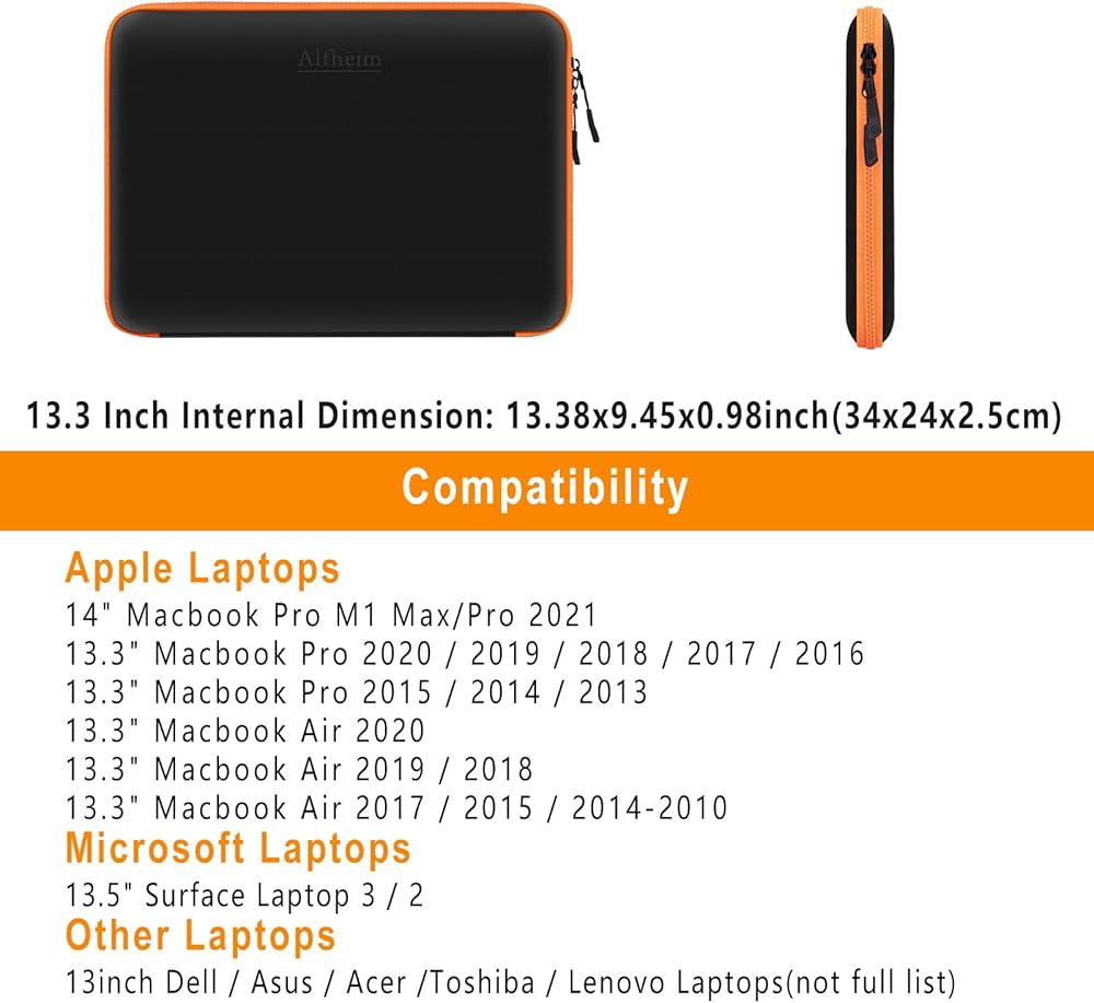 [Compatible device] Internal size: 34x24x2.5cm. This laptop bag is compatible with 14-inch MacBook Pro M1 2021, 13-13.3 inch laptops, such as 13-inch MacBook Pro 2012-2015 (A1425/A1502), 13-inch MacBook Air 2012-2017 (A1369/A1466), 13.5 notebook 4/3, 14 notebook computers, and more. Please check the size of your device against the internal dimensions of our laptop case to ensure a perfect fit.