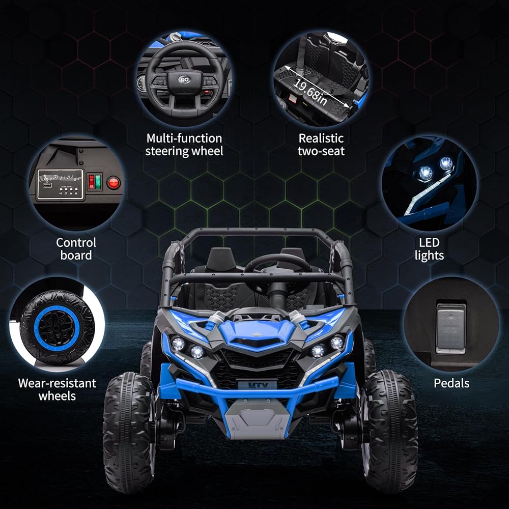 Exciting Features for Endless Entertainment:This ride-on UTV includes a one-click start function for easy operation and a built-in music player that lets kids enjoy their favorite tunes while driving. The vibrant LED lights add to the fun and visibility, enhancing the overall driving experience.