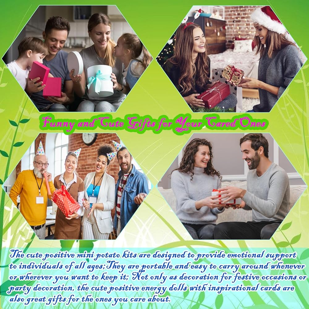 【Mini Funny Support Gag Kit】The cute positive mini potato kits are designed to provide support to individuals of all ages;They are portable and easy to carry around whenever or wherever you want to keep it;Not only as decoration for festive occasions or party decoration,the cute positive energy potato with inspirational cards kit are also great for women,mom,her,girlfriend, boyfriend,husband,wife,classmate,colleague,family,lover,or anyone in need of encouragement on birthday,graduations, anniversary,holiday,Mother's Day,Father's Day,Thanksgiving,New Year,Valentines Day,etc.