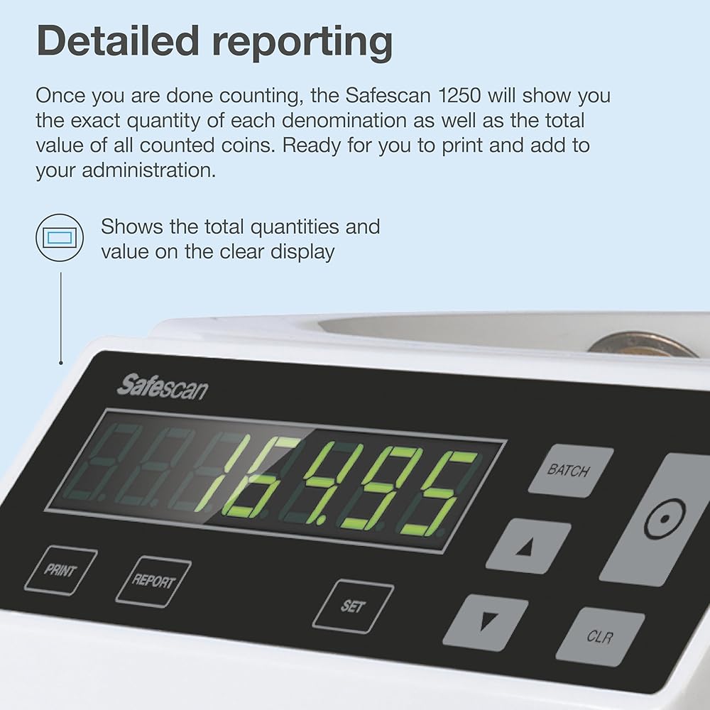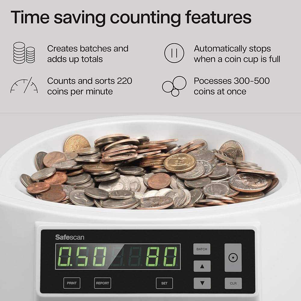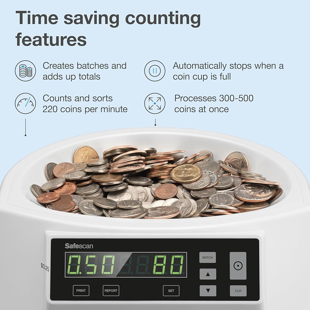 CONVENIENT BATCH FEATURE: The Safescan 1250 automatically stops counting whenever a coin cup is full, but it can also be set-up to stop whenever it reaches a desired number of coins. Making it easier for you to prepare your coin rolls, coin bags, cash drawers, and bank deposits.