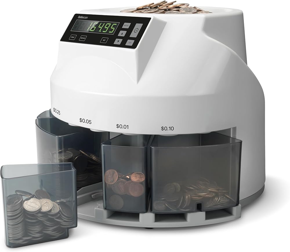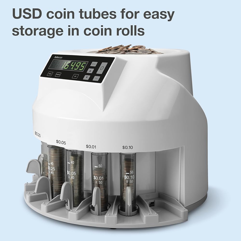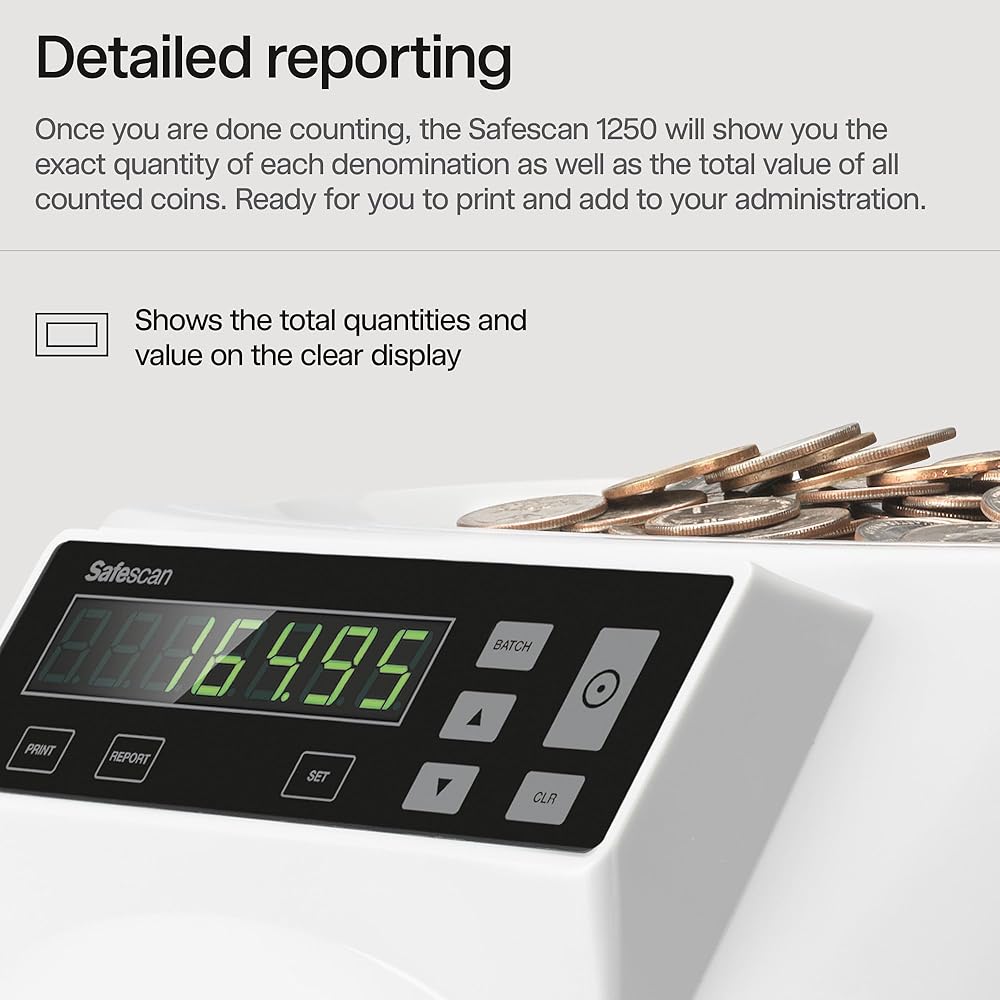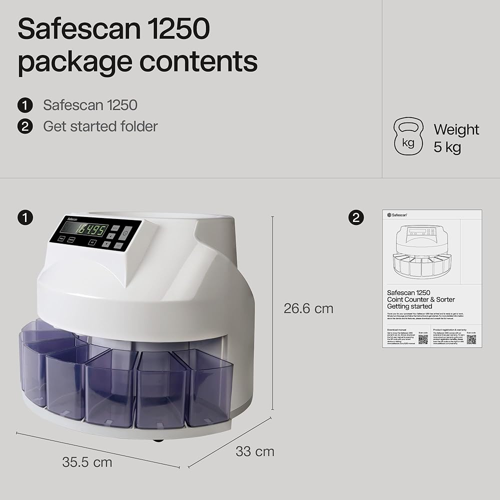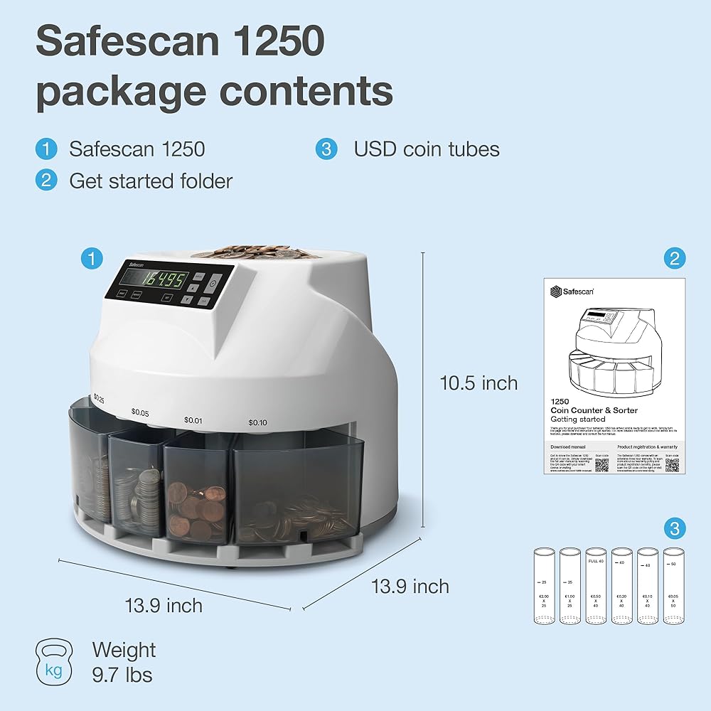 ACCURATE COIN COUNTING & SORTING: Process your coins in no-time. The Safescan 1250 rapidly value counts mixed USD coins and accurately sorts them per denomination. Within minutes you will have a complete overview of all counted and organized coins, ready to add to your administration.