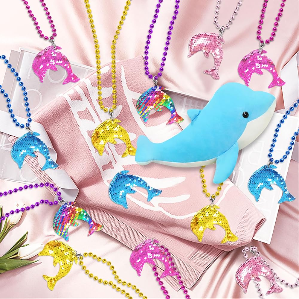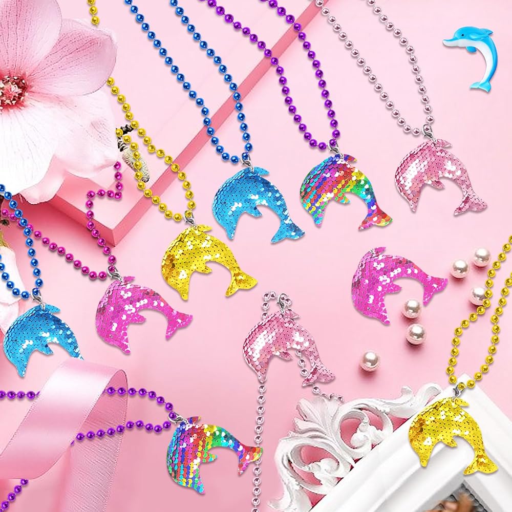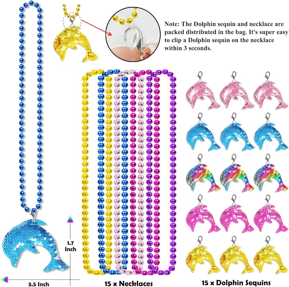 【What You Get】3 x Gold Dolphin Sequin Necklace; 3 x Pink Dolphin Sequin Necklace; 3 x Blue Dolphin Sequin Necklace; 3 x Rose Red Dolphin Sequin Necklace; 3 x Colorful Dolphin Sequin Necklace. Note: The sequin and necklace are packed distributed in the bag. Recommended Age Grade: above 12 years