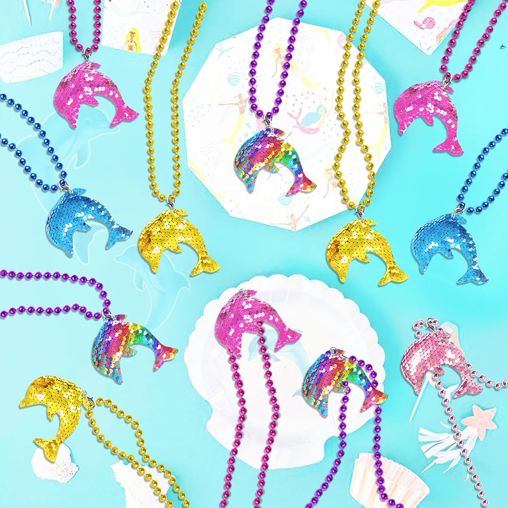 CiciBear 15 Pack Dolphin Sequin Necklace Party Favors with Mardi Gras Beads for Sea World Themed Party Favors, Home Decorations, Festivals,Wedding, Birthday Celebrations, 5 Colors