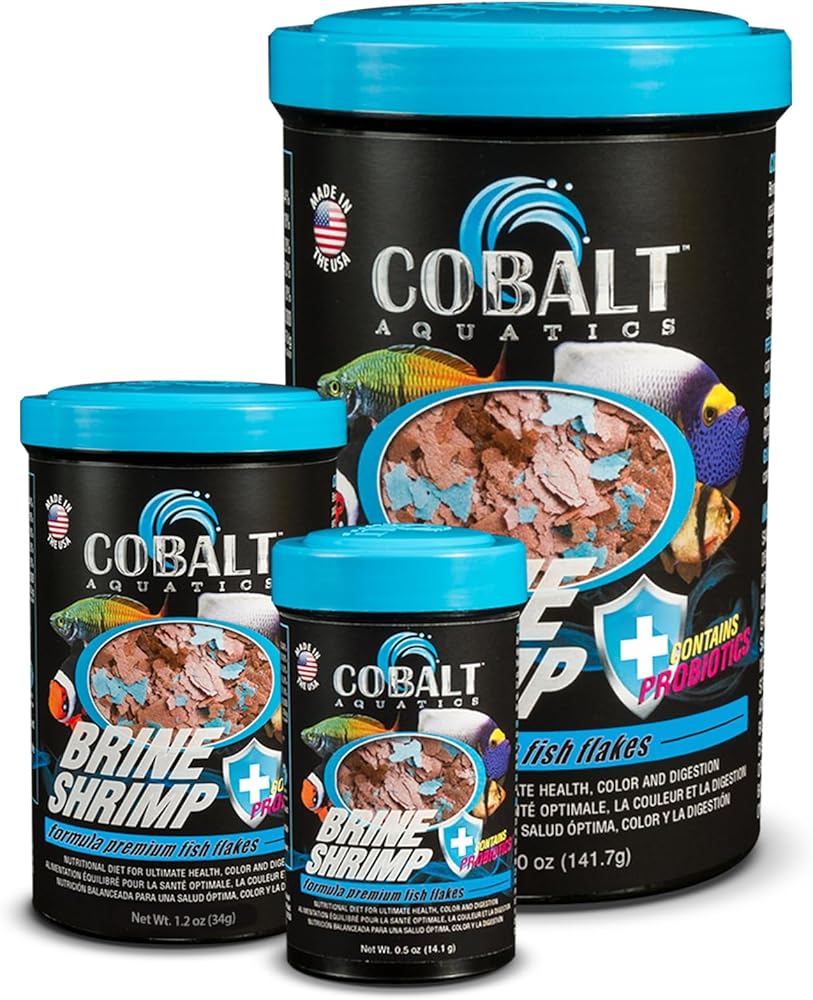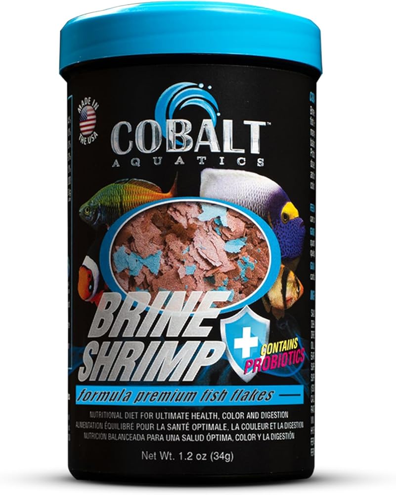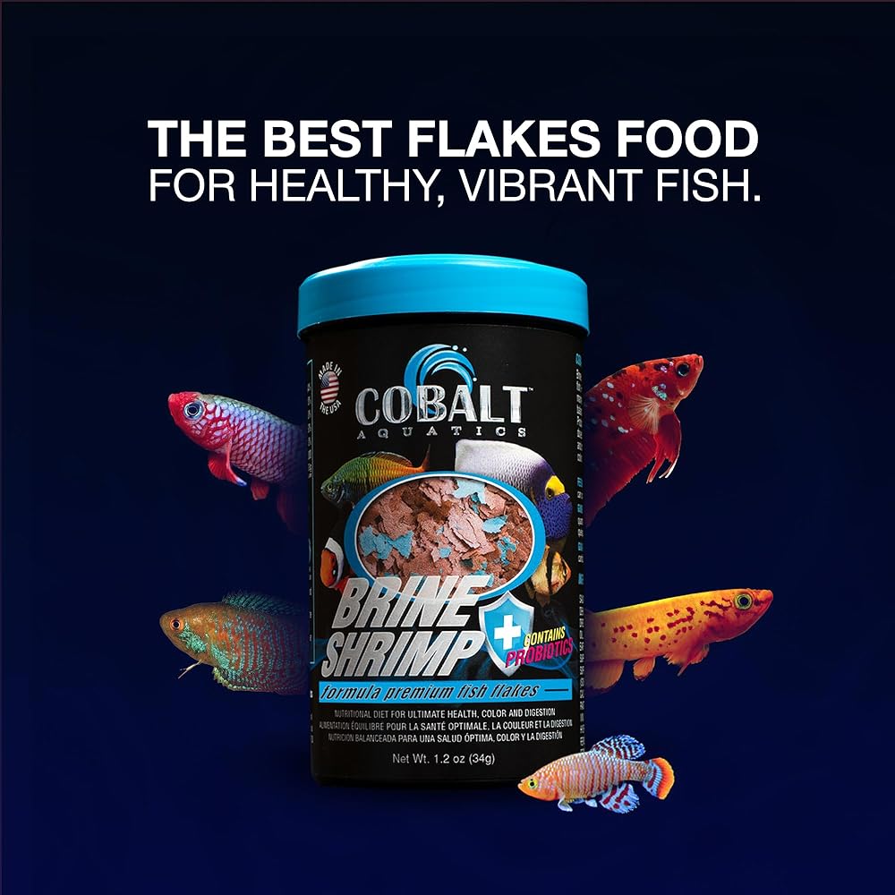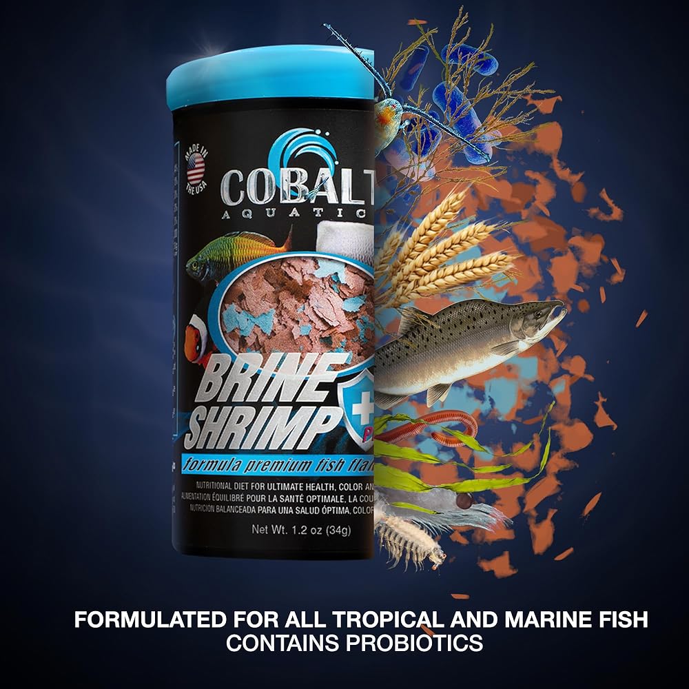 Dried brine shrimp based formula for all tropical and marine fish. Highly palatable formula helps both finicky freshwater and marine fish to eat prepared foods. Nutritionally balanced for consistent growth and color. Probiotics and Cobalt BLUE Flakes help support a healthy digestive and immune system and keep the fish in top shape and color. Less waste for a cleaner aquarium! Will not cloud water!