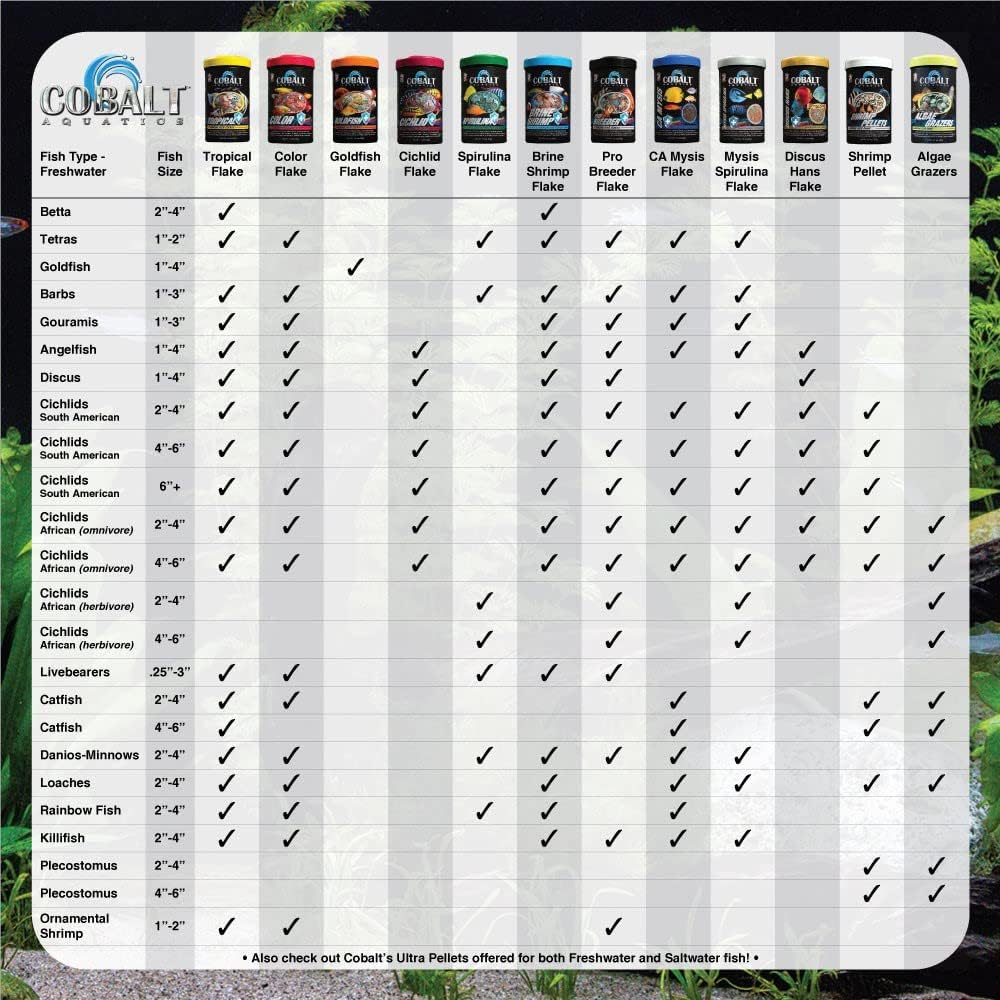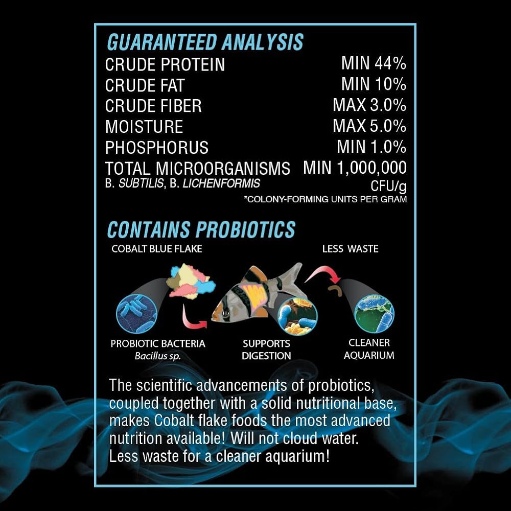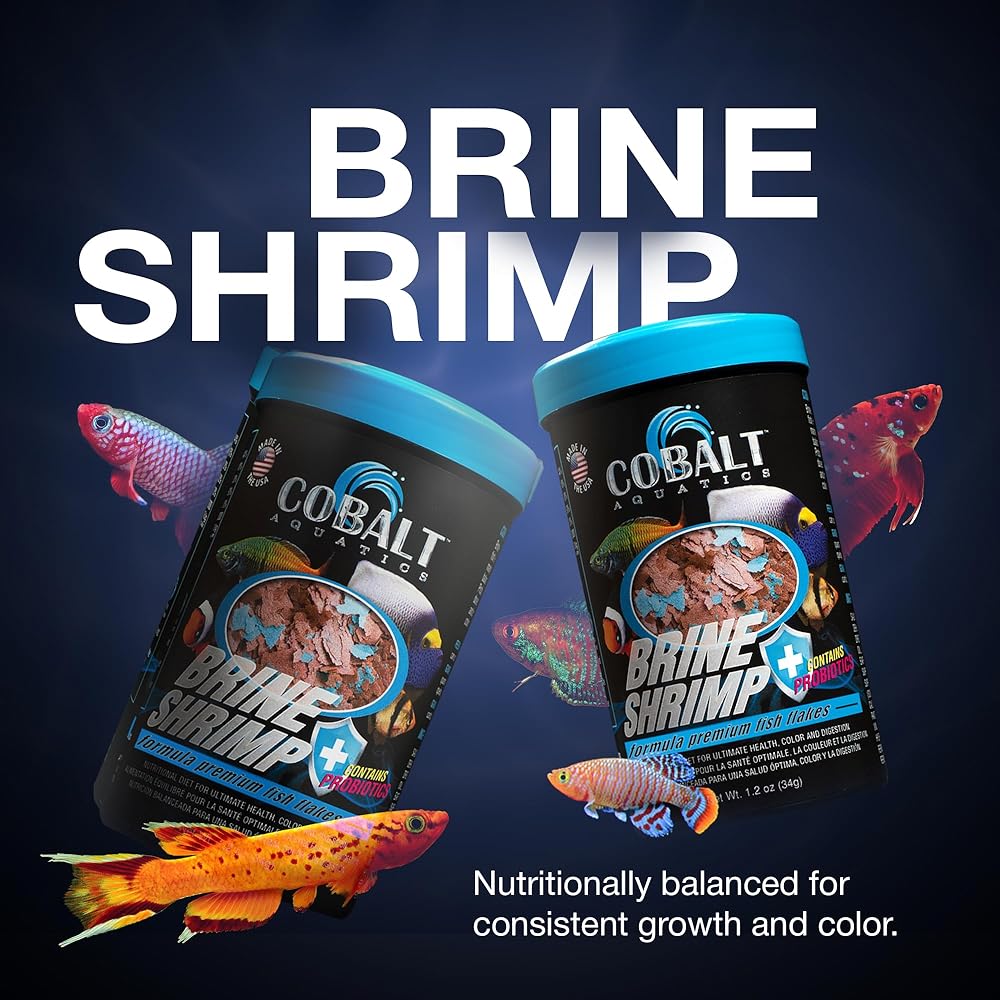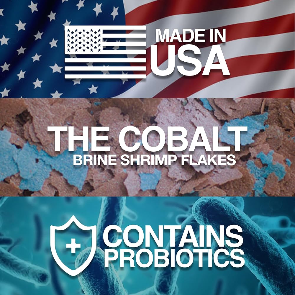 Dried brine shrimp based formula for all tropical and marine fish. Highly palatable formula helps both finicky freshwater and marine fish to eat prepared foods. Nutritionally balanced for consistent growth and color. Probiotics and Cobalt BLUE Flakes help support a healthy digestive and immune system and keep the fish in top shape and color. Less waste for a cleaner aquarium! Will not cloud water!
