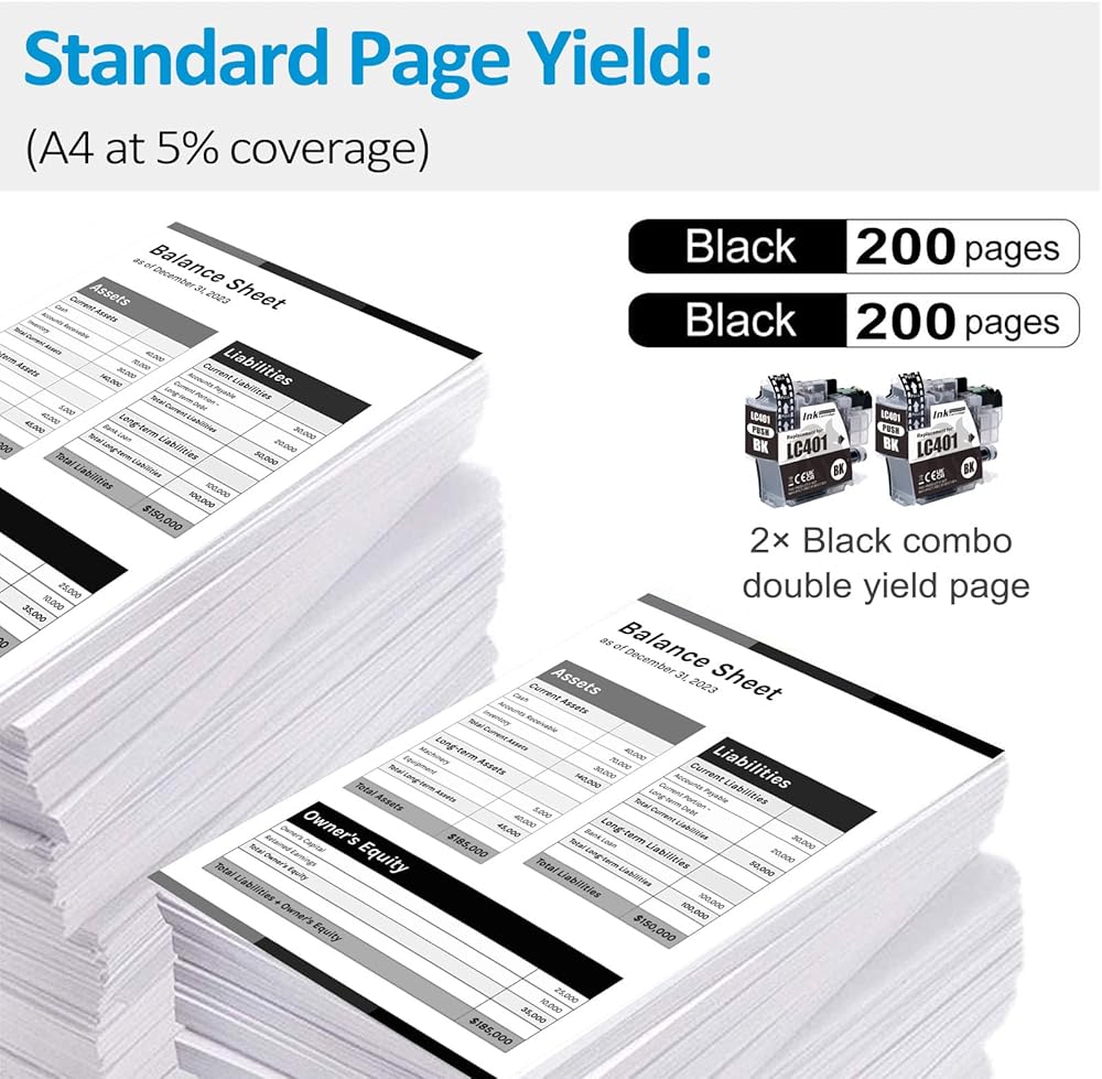 High Yield: Up to 200 pages per LC401 black ink cartridge, up to 200 pages per LC401 color ink cartridge (At 5% coverage A4 paper). LC401 5-Pack value pack includes 2pcs black, double black yield