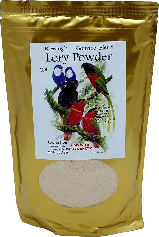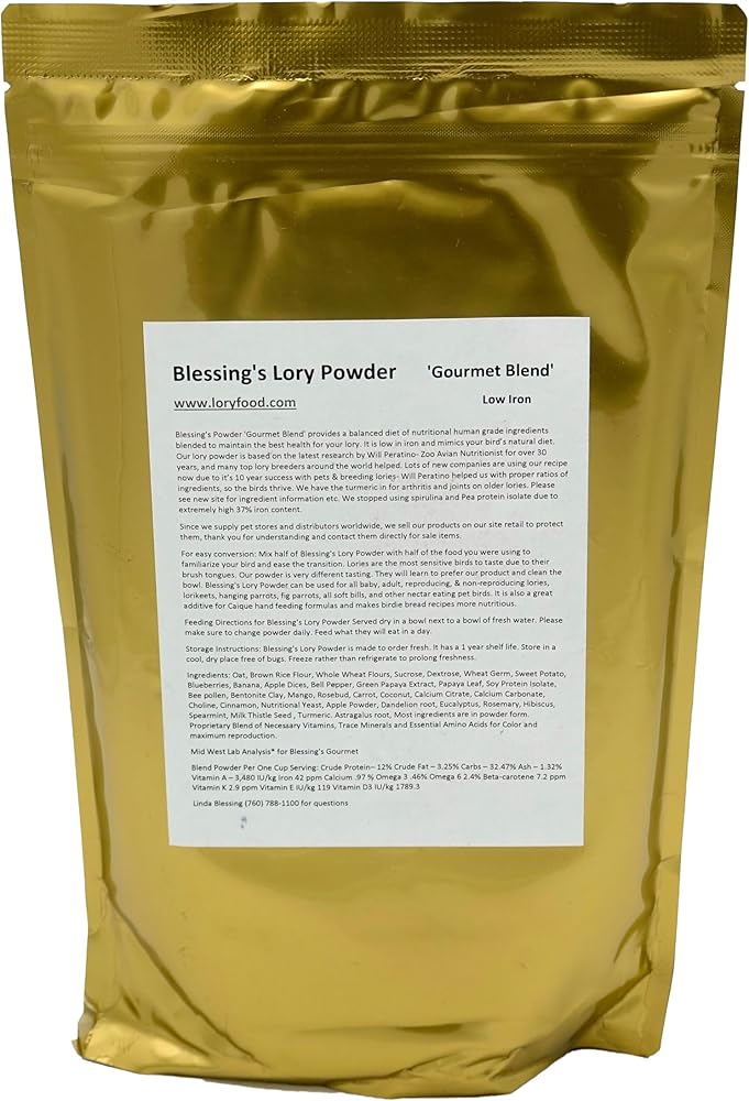 LORY POWDER- "Gourmet Blend" Was created to be a nutritional powder with bee pollen, dried flowers,fruits, and 16 other ingredients. Feed dry with water bowl close, as lories are dippers! Blessing Super Foods nutrients are from Natural ingredients ground up and mixed, not just sugar,soy flour, artificial favoring, and added supplements. They have been breeding parrots for 30 years and have always felt that nutrition was the number one factor in successful breeding of any living animal. They believe that humans get their nutrients from natural food sources, so should the animal we own. Eating junk food and buying vitamin tablets is not the same. This lory food is a complete balanced diet. It was formulated in the US and fine tuned by some of the biggest Aussie & US breeders. They do their own milling and packaging to control the quality in all of their products. They only use human grade ingredients in a very clean mixing environment.