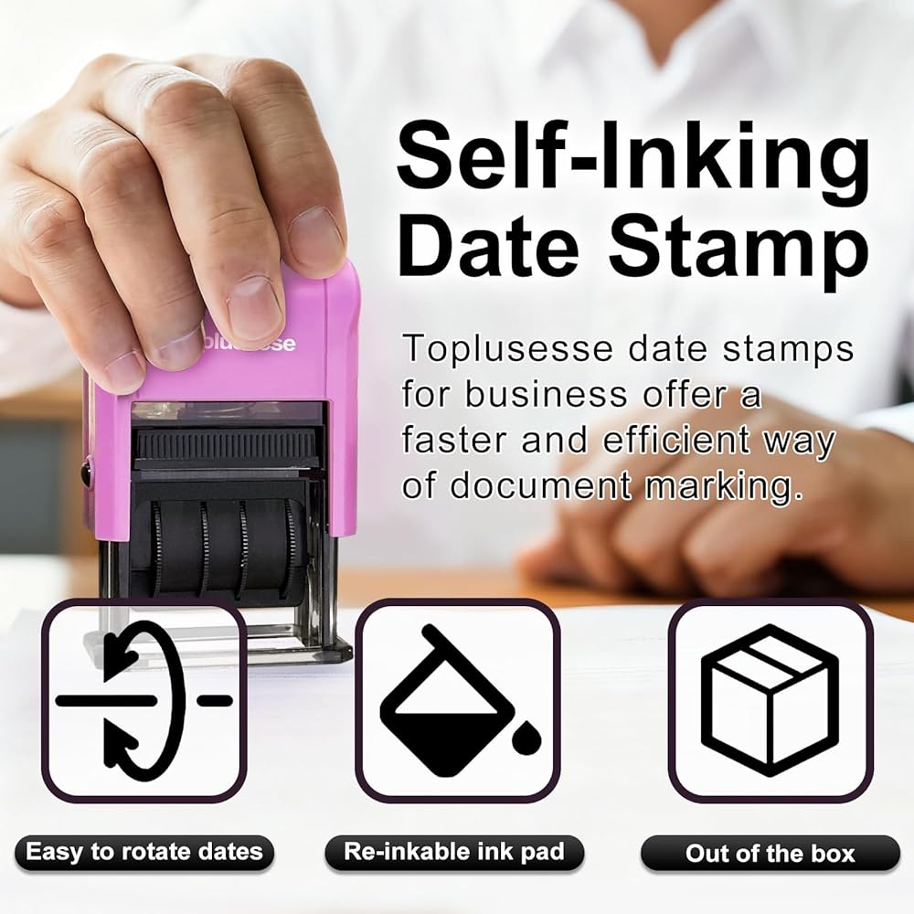 【Bright& Crisp Impression of Date Stamp with Turned In】The purple turned in stamps come with the modern transparent bottom, easy for alignment, leads a clear and clean impression each stamping. Please kindly press down the turned in stamp with a bit pressure to get the perfect imprints. we recommend that trying a few times before stamping on your document, or it may ruin your document due to too much ink.