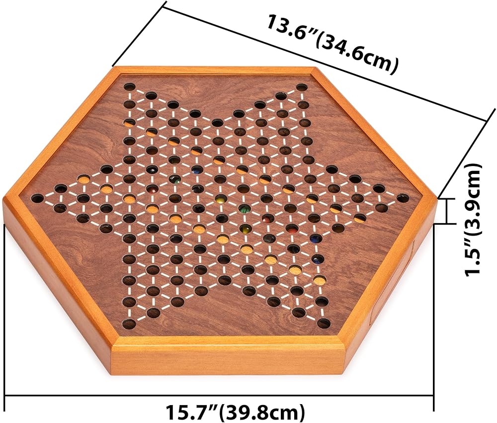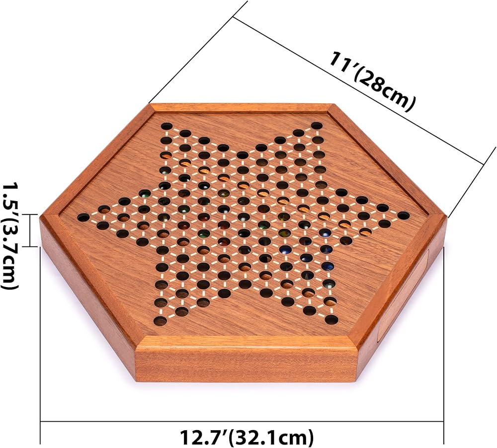 Wooden Game Board: The board measures 12.7 x 11 x 1.6 inches (32.2 x 28.2 x 4 centimeters) and contains drawers for conveniently storing glass marbles
