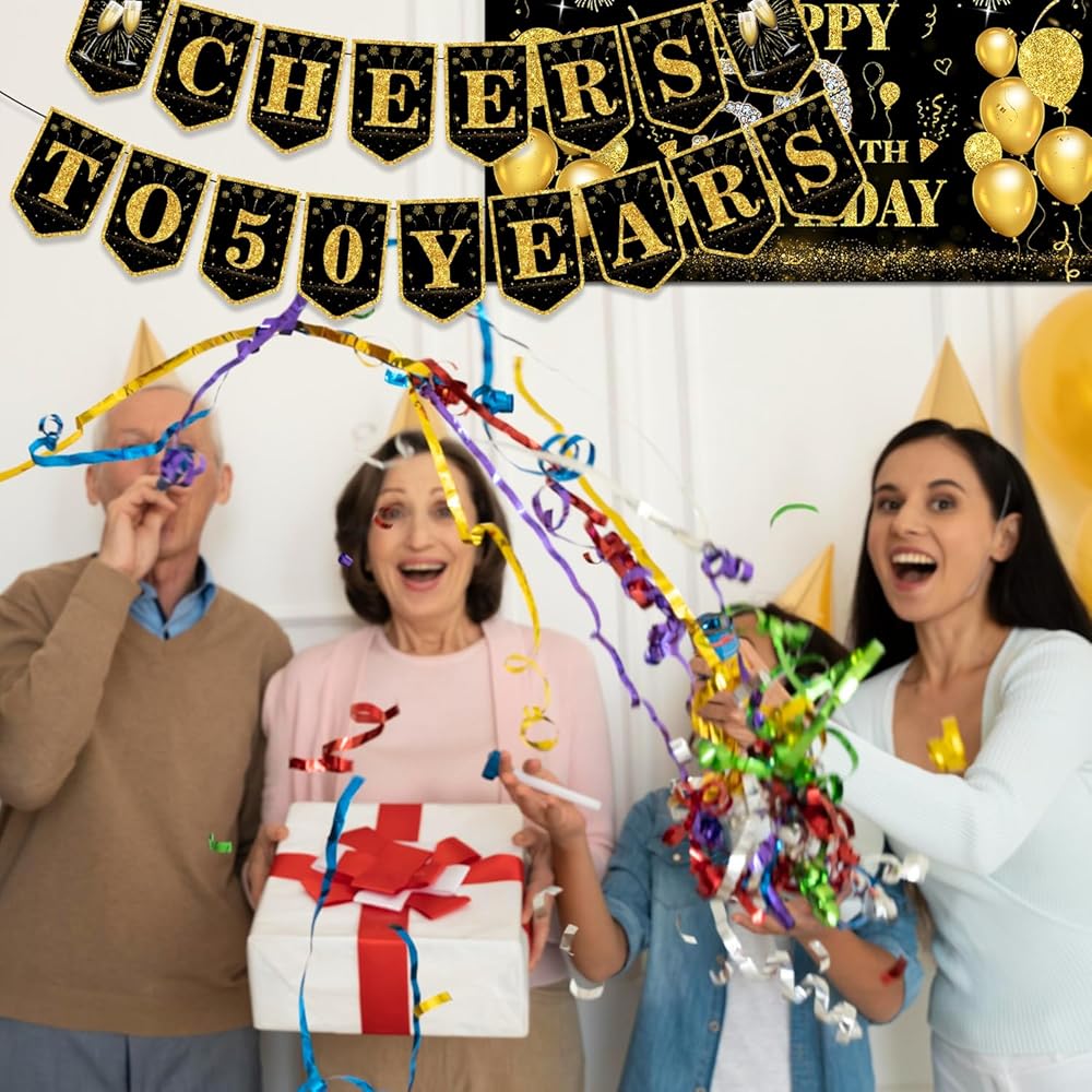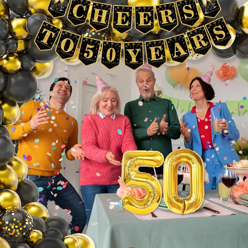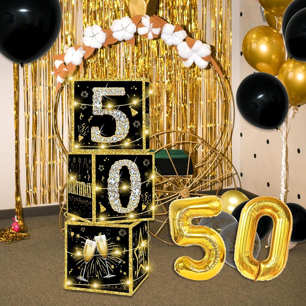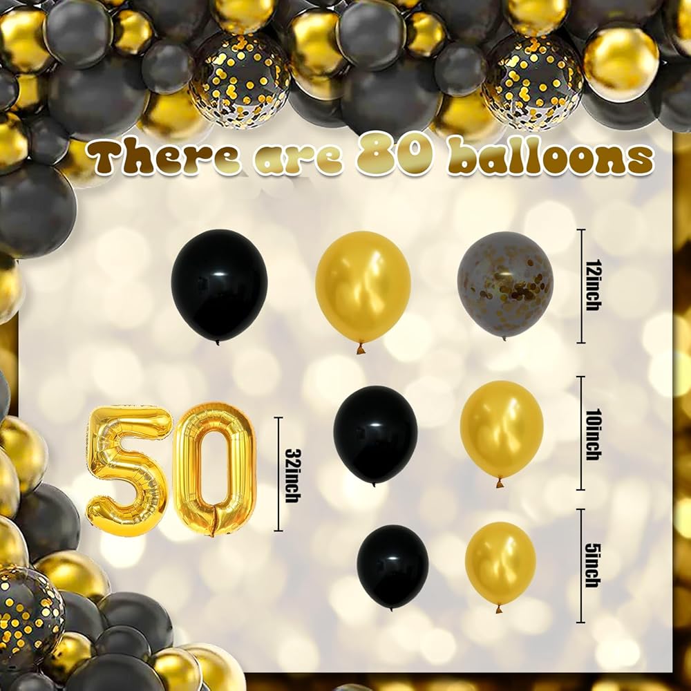 cocomigo 50th Birthday Decorations for Men 50th Birthday Decorations for Women, 87pcs Black Gold Happy 50th Birthday Party Balloons Banner Backdrop Balloon Box with Light, 60th Birthday Party Supplies
