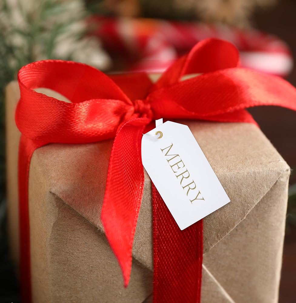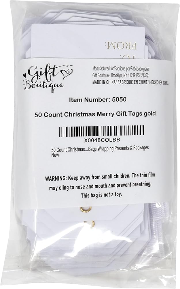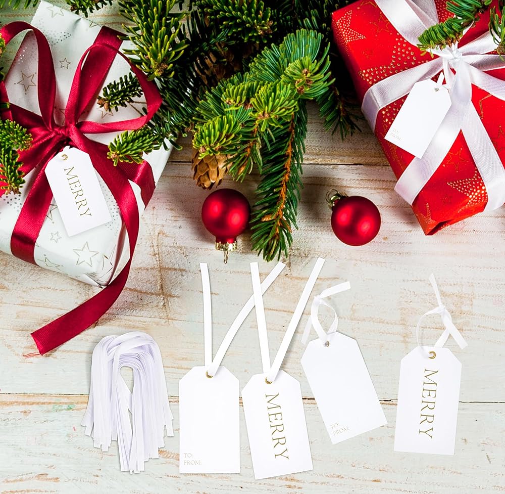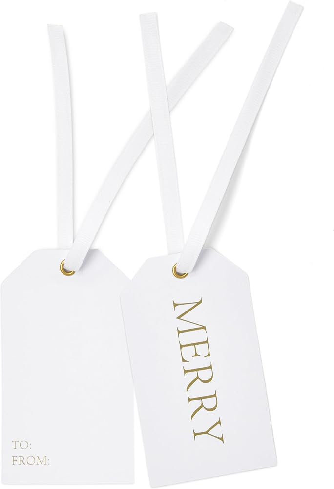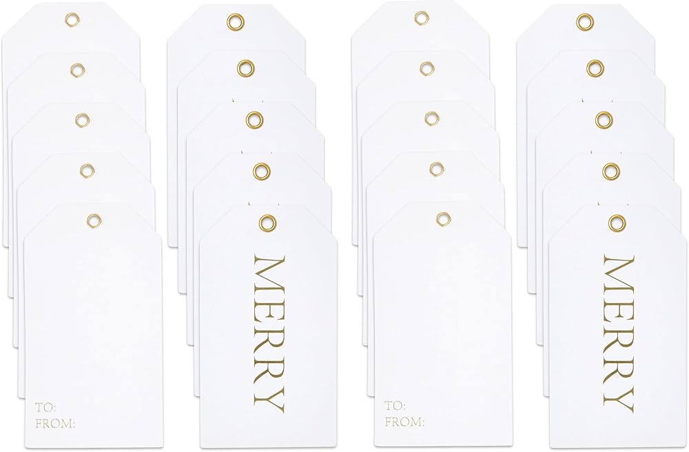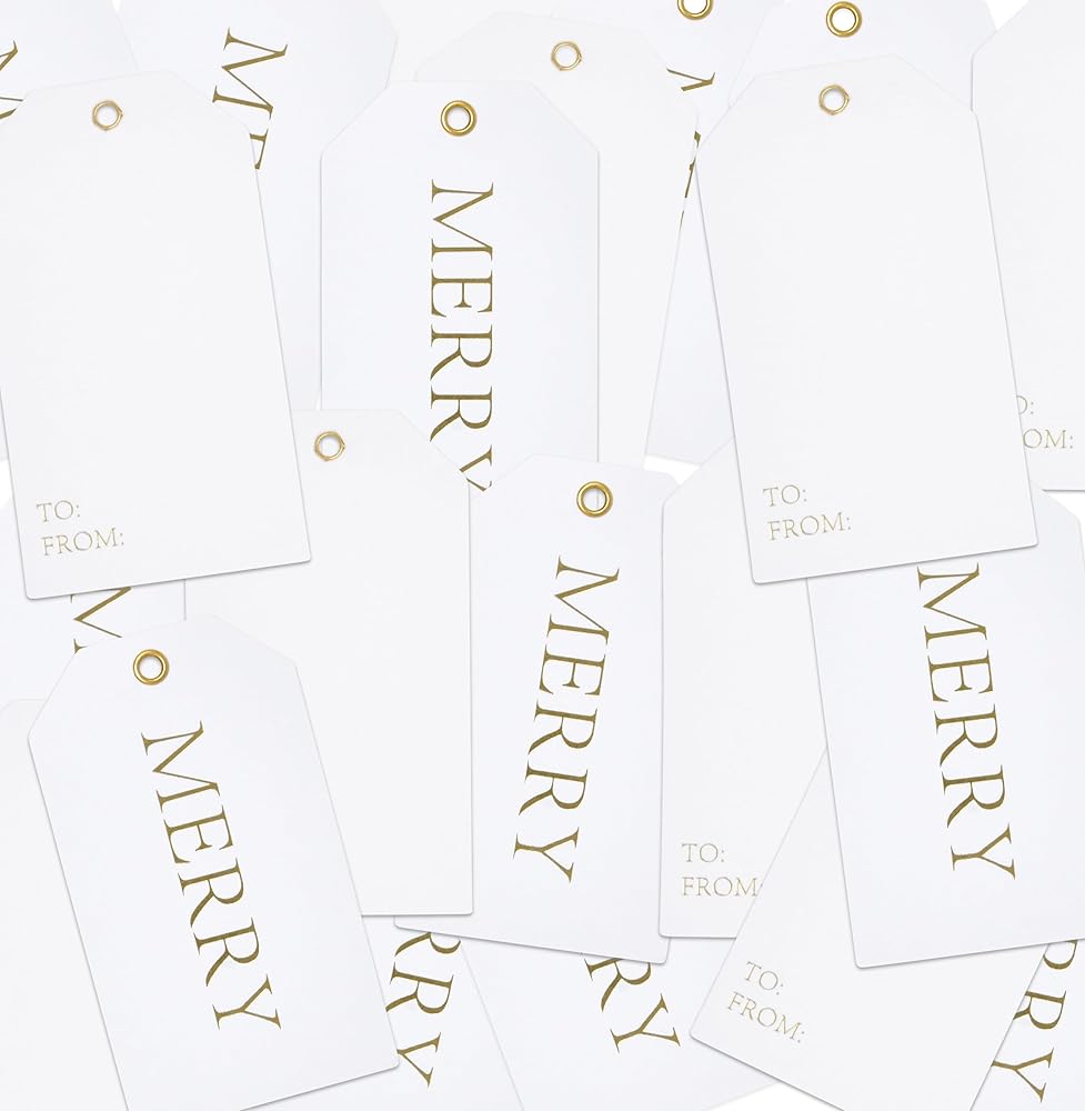 Gift Boutique Set of 50 Christmas Gift Tags; Write in your personal holiday wishes on the back of the tag; each tag comes with to and from in the back for easy gift giving. Beautiful Christmas gift tags with Merry printed in metallic gold foil; great addition for Christmas gift, boxes, tree ornaments, bottle decorations… Tags measure approximately 3.75" x 2.125" each and come with jute twine string for easy tying; it's easy to hang; you can cut the string into any size to meet your demands. Made of high quality thick card stock paper that can be useful when you send a parcel, present, souvenir or decorate Christmas tree; good substitute of gift labels and gift stickers.