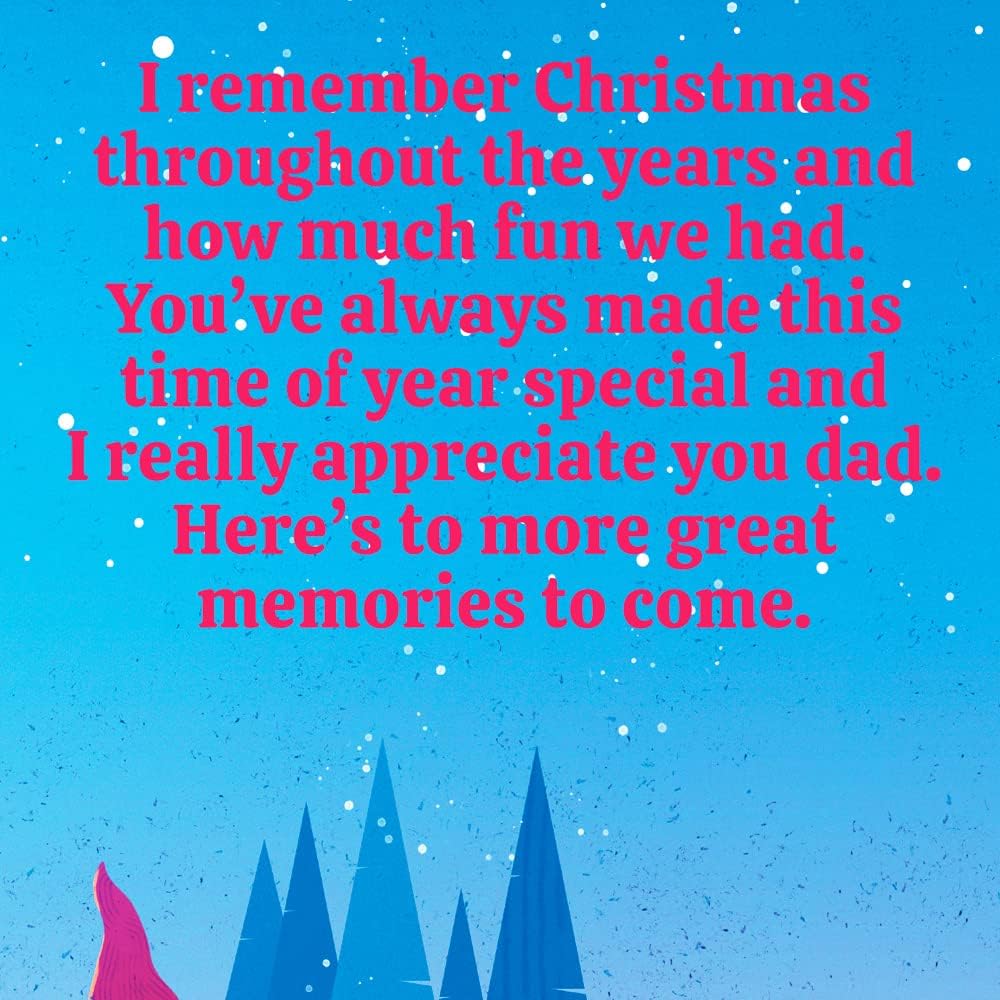 INSIDE MESSAGE: I remember Christmas throughout the years and how much fun we had. You've always made this time of year special and I really appreciate you dad. Here's to more great memories to come. Merry Christmas