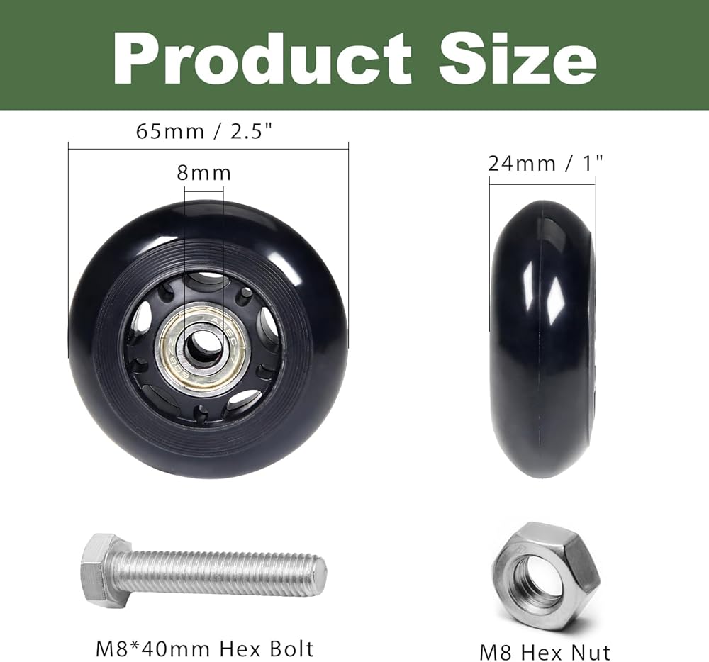 SIZE - Whole wheel diameter is 65mm/2.5-inch; Wheel width is 24mm/1-inch; Shaft dia.: Fit for M8 screw