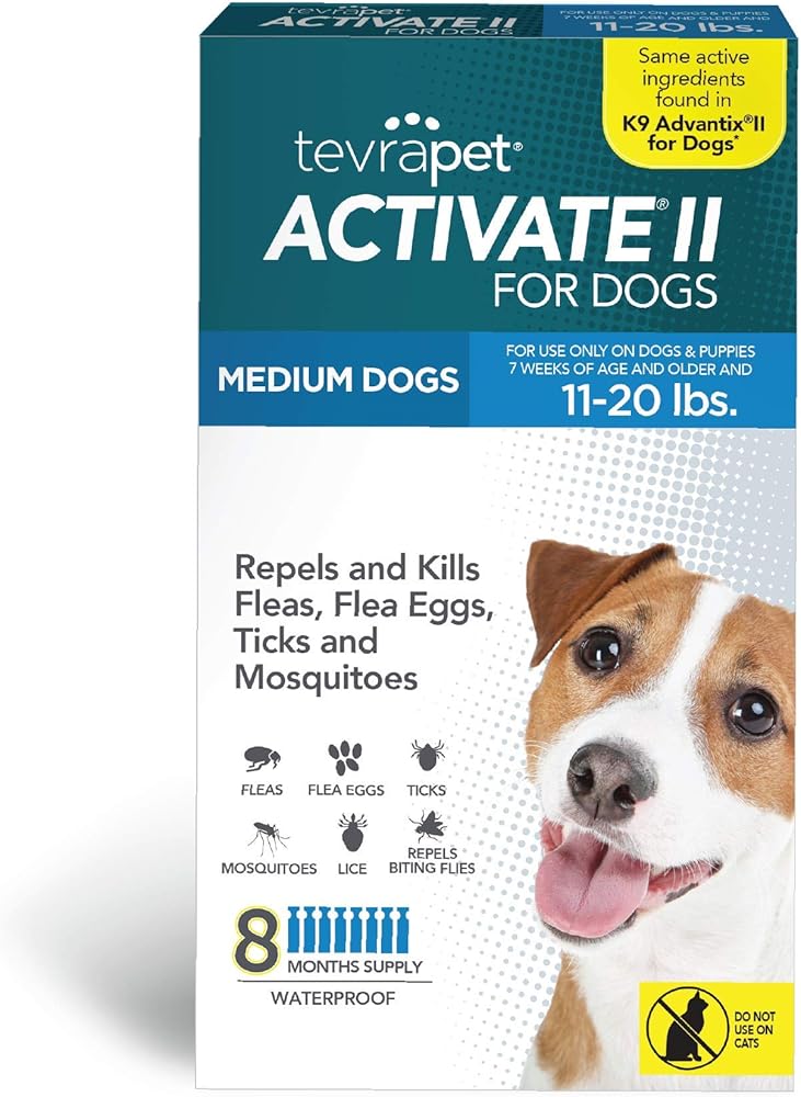 TevraPet Activate II for medium dogs contains imidacloprid, permethrin and pyriproxyfen, the active ingredients found in K9 Advantix II for dogs. This broad spectrum topical not only KILLS but repels fleas, flea eggs, ticks and mosquitoes. Activate II for dogs also kills ALL stages of fleas, repels biting flies and kills lice. The package includes 8 applicators, each good for 1 month of protection. Apply this product monthly for up to 8 months of protection for your pet and household. Only for dogs 7 weeks or older. Not for use on cats. EPA Reg. # 92334-1-92413