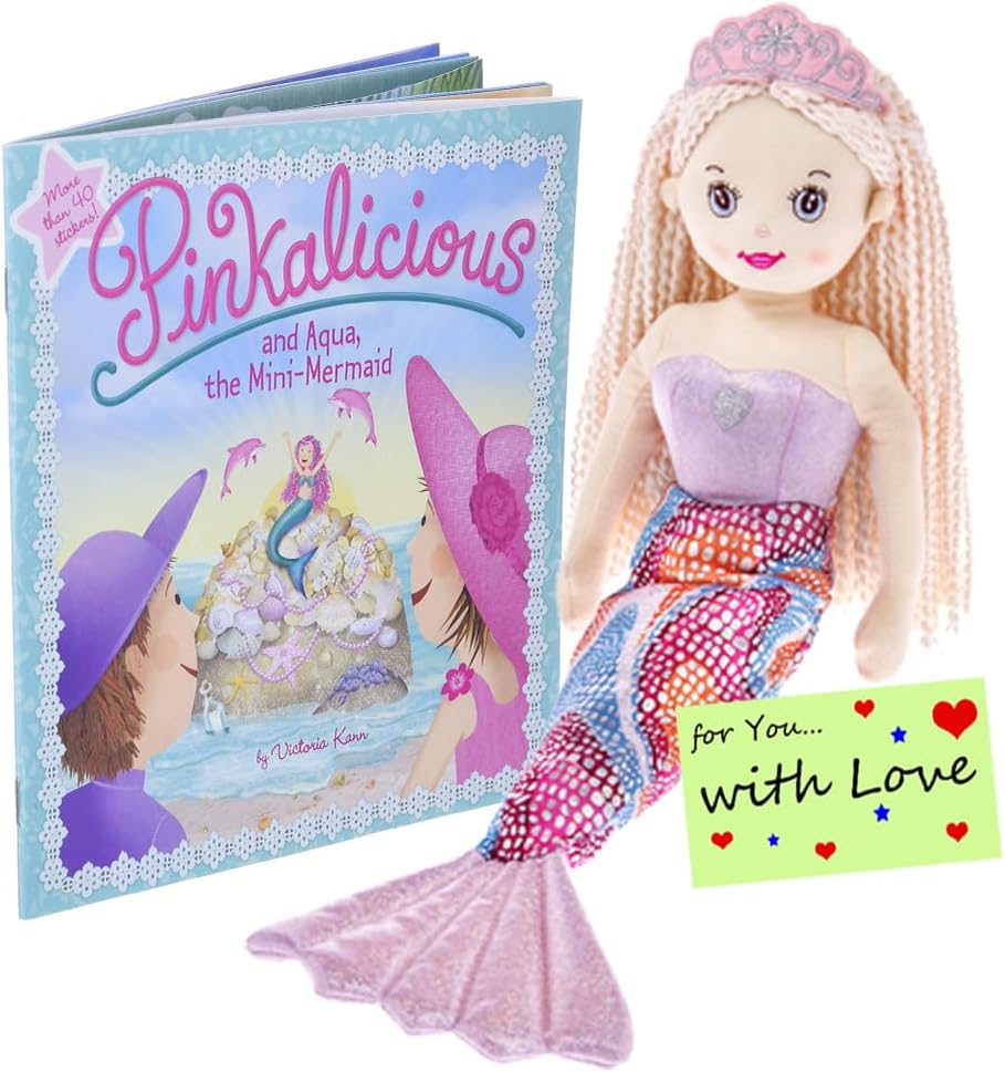 Does your child love mermaids? Is she a fan of PInkalicious books? Then this gift set is perfect for your little girl. Ganz Shimmer Cove Marlowe has Red hair and dimples. She is wearing a Pink top and has a colorful festive rainbow mermaid tail. Quality made, she will be your daughter's confident and companion for years to come Paired with Pinkalicious and Aqua, the Mini-Mermaid book. A fun story about Aqua who goes on adventures with Peter. They visit a cove filled with rainbow-colored shells and sea glass. At the end of the 24 page book they encounter dolphins! Comes with a sheet of beautiful stickers Perfect get set for Mermaid lover.