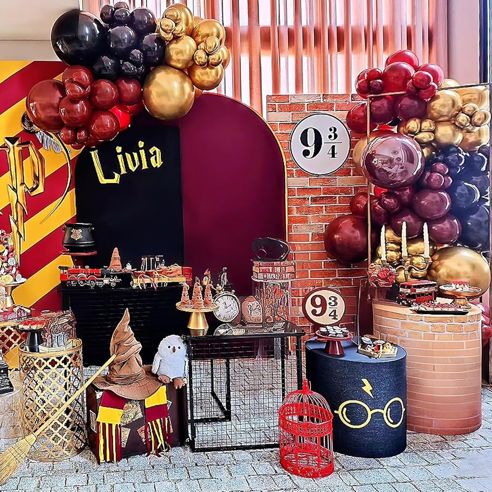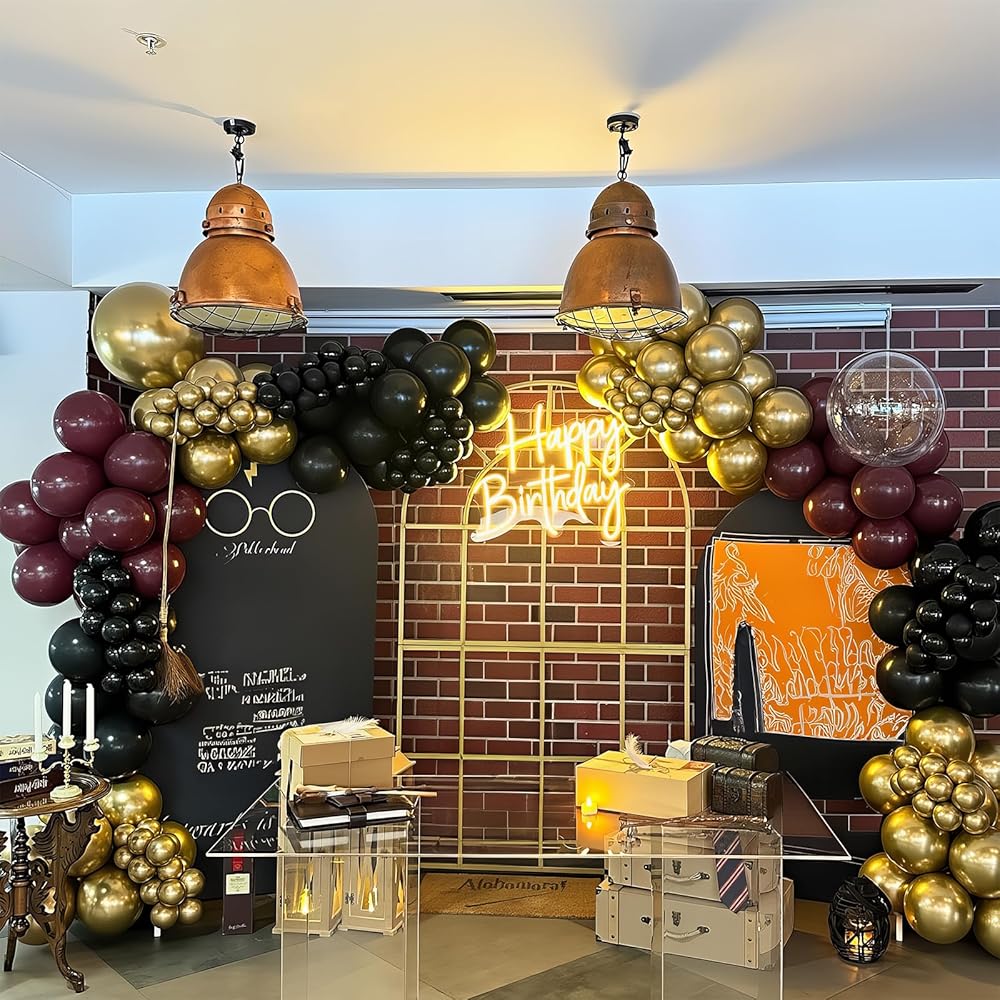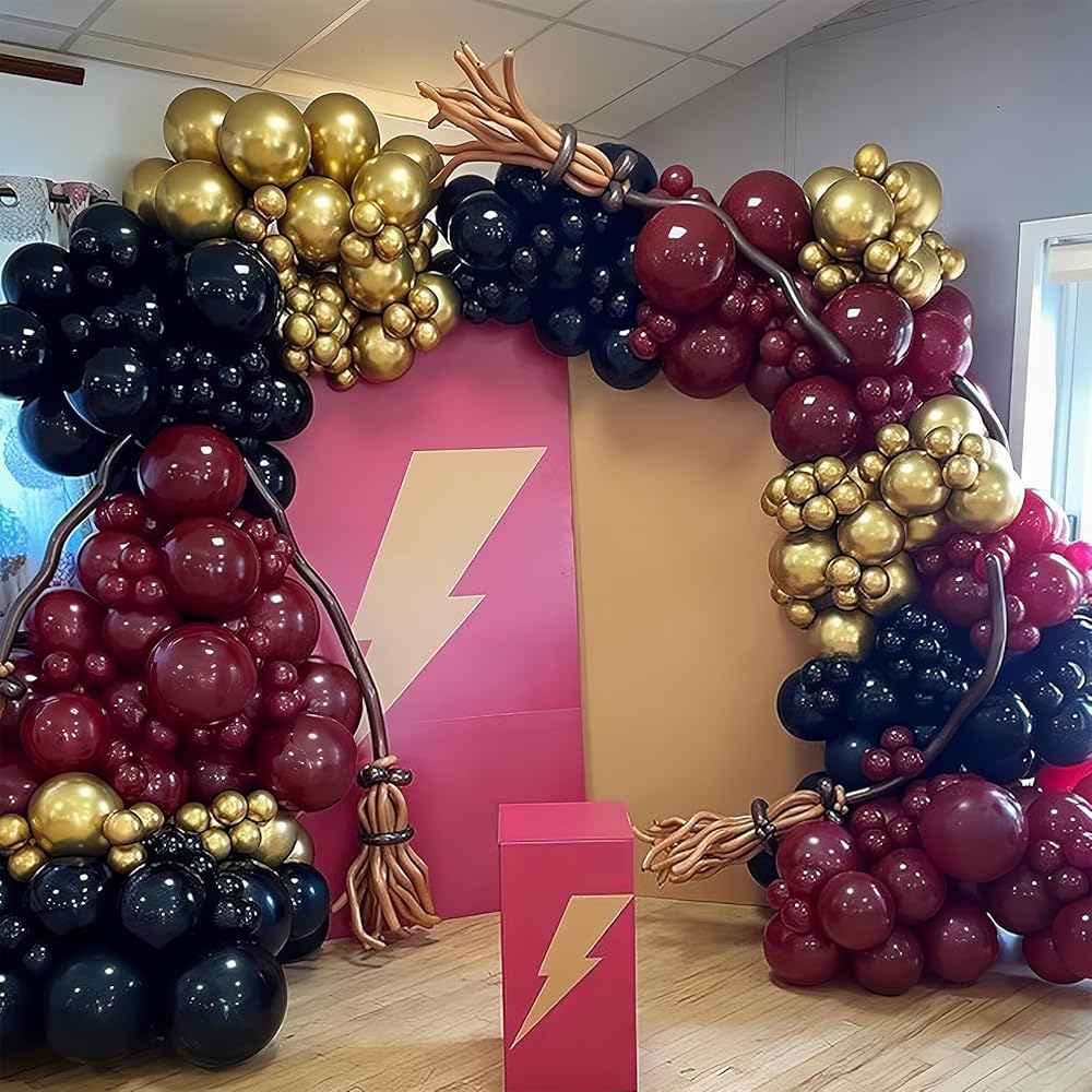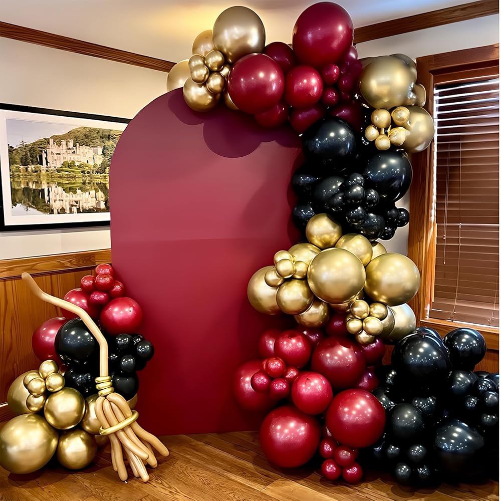 Dark Red Black and Gold Balloon: Includes metallic gold balloons (12 in; 10 pcs ); matte black latex balloons (12 in; 10 pcs ); ruby red balloons (12 in; 10 pcs ); confetti balloon(12 in; 5 pcs ) and a roll white ribbon; This balloons matte black gold red can add a unique atmosphere to your burgundy themed birthday