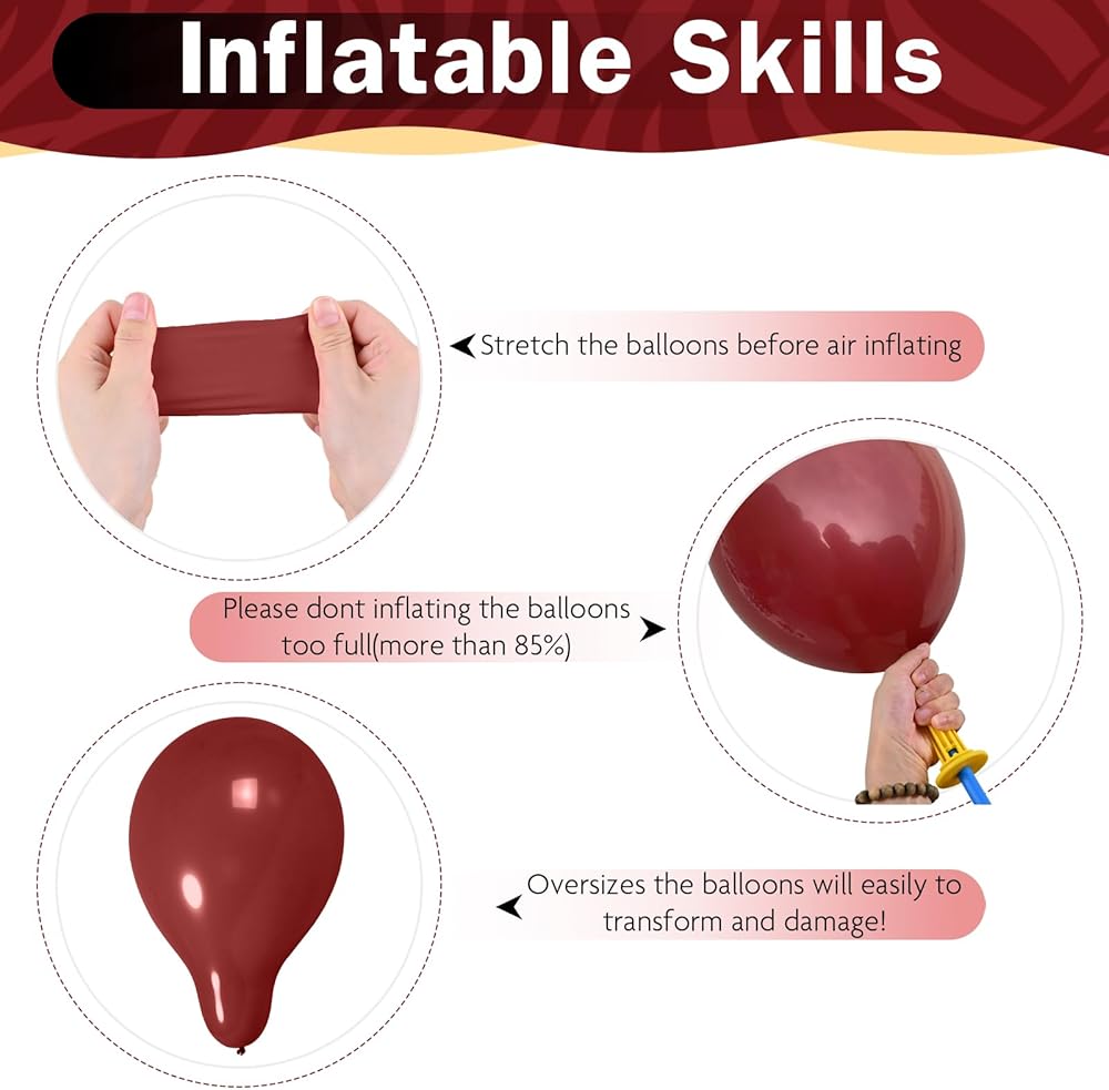 Easy to Use : These kids' party balloons for birthday party can be easily inflated with air or helium; Blow them up with a mouth, pump or helium; If you want them to float; make sure to fill them with helium; We provide balloon ribbons to help you creat various maroon and gold balloon arch kit