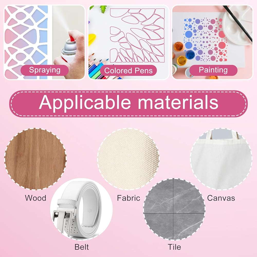 【Material Safety】: Our paint stencils for reusable are made of PET, and the patterns are cut by machines and will have a heat-shrink smell. It is recommended to clean them before use. The drawing stencils are sturdy and strong. The grinding process is used to ensure that the inner and outer edges are not sharp. It is safe for you and your family and can be used for a long time, bringing you more DIY fun