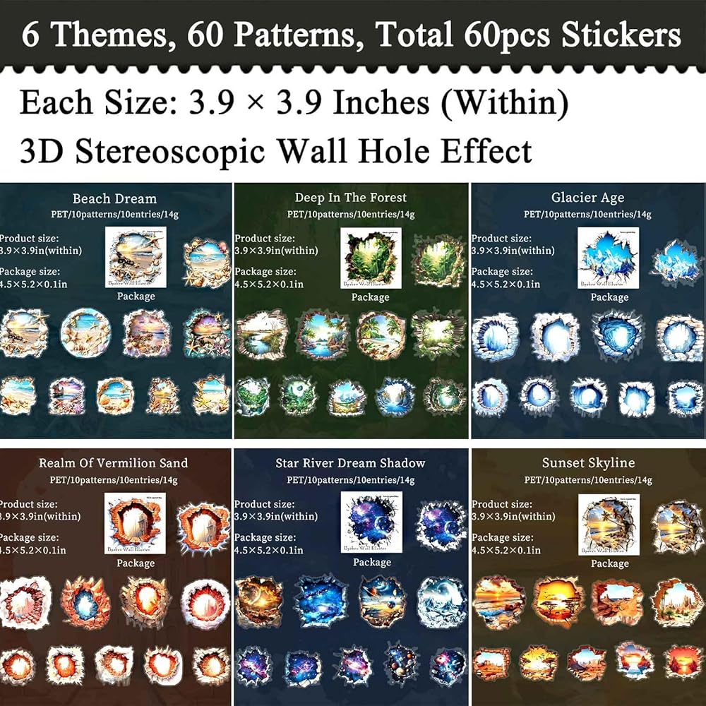 Unique Patterns, 6 Magical Themes - Get lost in creativity with 60 one-of-a-kind stickers, each featuring a different design from 6 dreamy themes: Beach Dream, Deep In The Forest, Glacier Age, Realm of Vermilion Sand, Star River Dream Shadow, and Sunset Skyline. Each theme comes in its own pack of 10, packed with vibrant, realistic effects to make your journals and scrapbooks truly stand out.