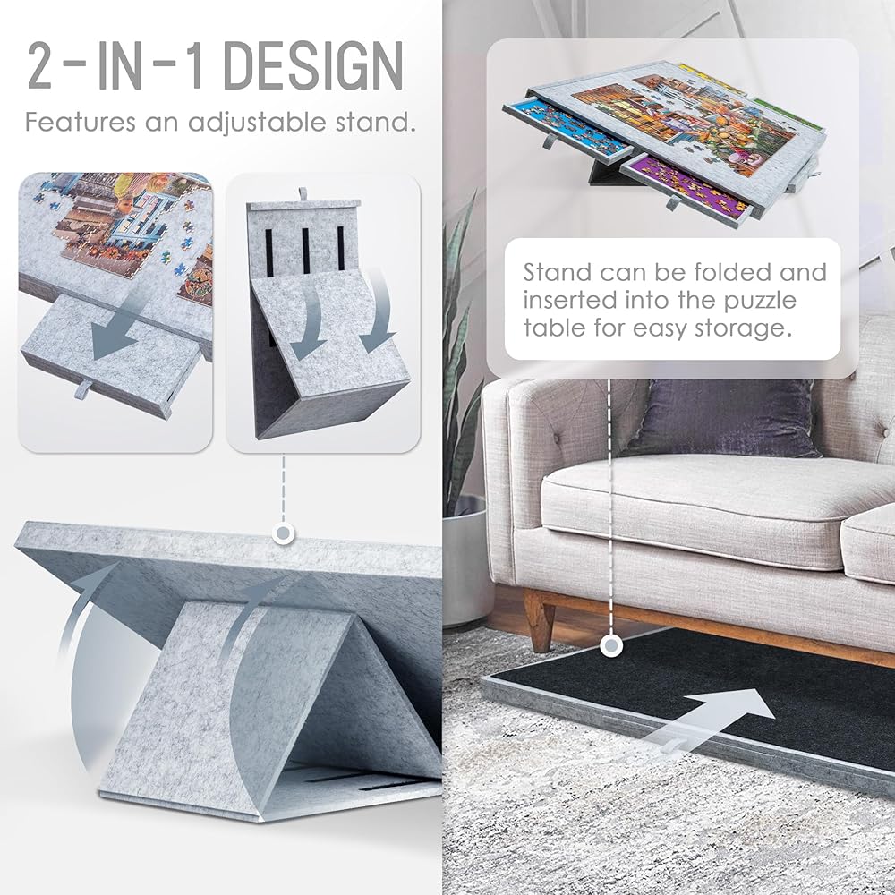 2-in-1 Design - Designed with an independent adjustable stand. Just set it up to support the puzzle board and store it inside the puzzle board like a drawer while not in use. Easy adjustments ensures you with endless puzzle fun by helping to avoid a stiff neck or stressed back.