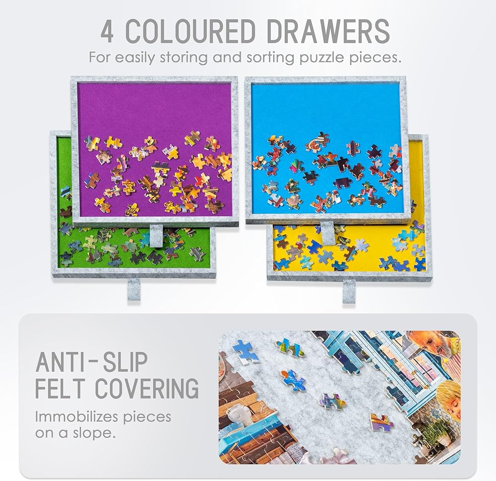 4 Colored Drawers - Designed with 4 colored drawers to sort out puzzle pieces as well as to preserve your unfinished puzzle game. Each drawer is designed with a handle for easy pulling out. Also stay closed when not in use and leave you no worry about missing pieces.