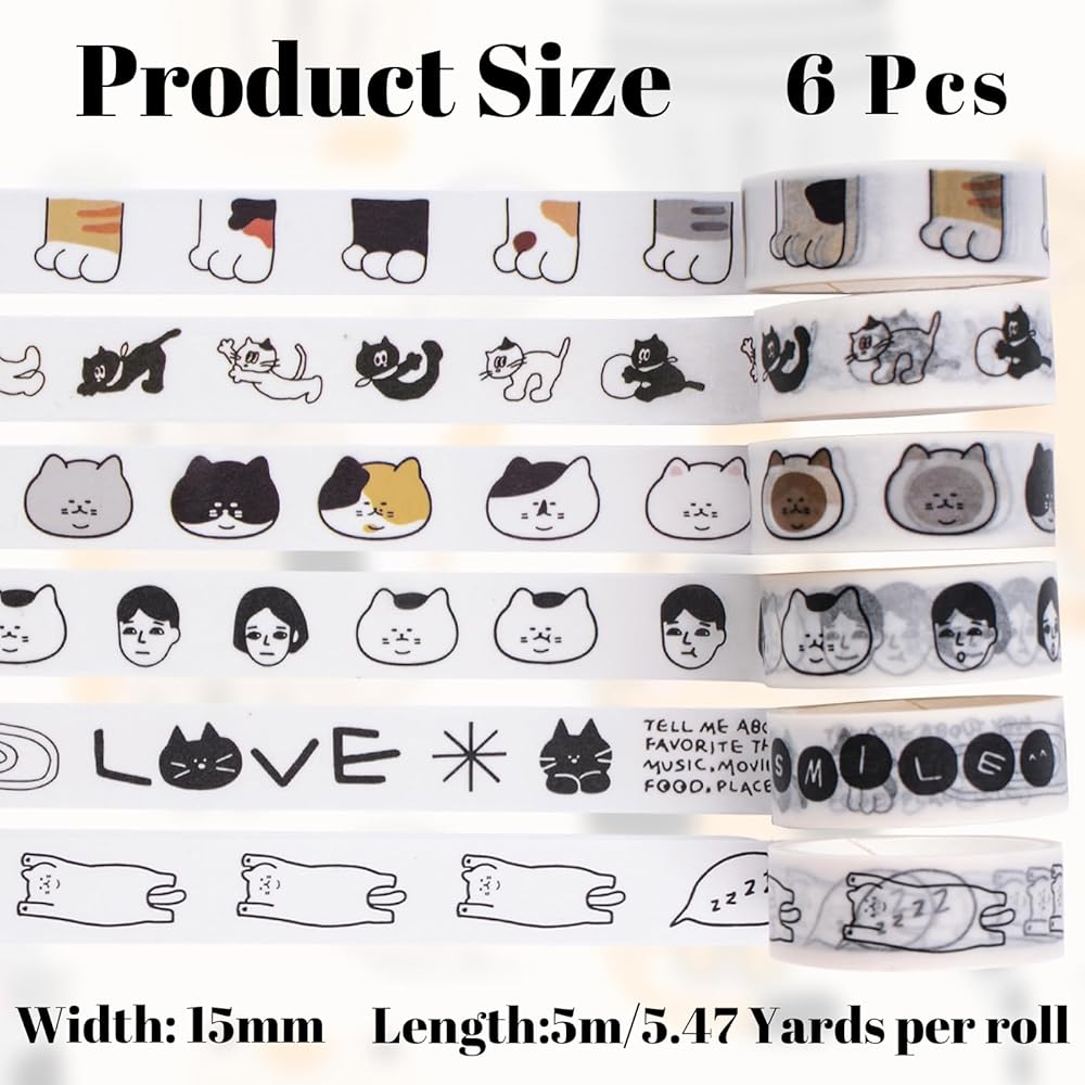 【PACKAGE INCLUDE】You will receive 6 pcs cat washi tapes, with six different styles. Each roll of tape is 0.59inch wide and 5.46yard long.