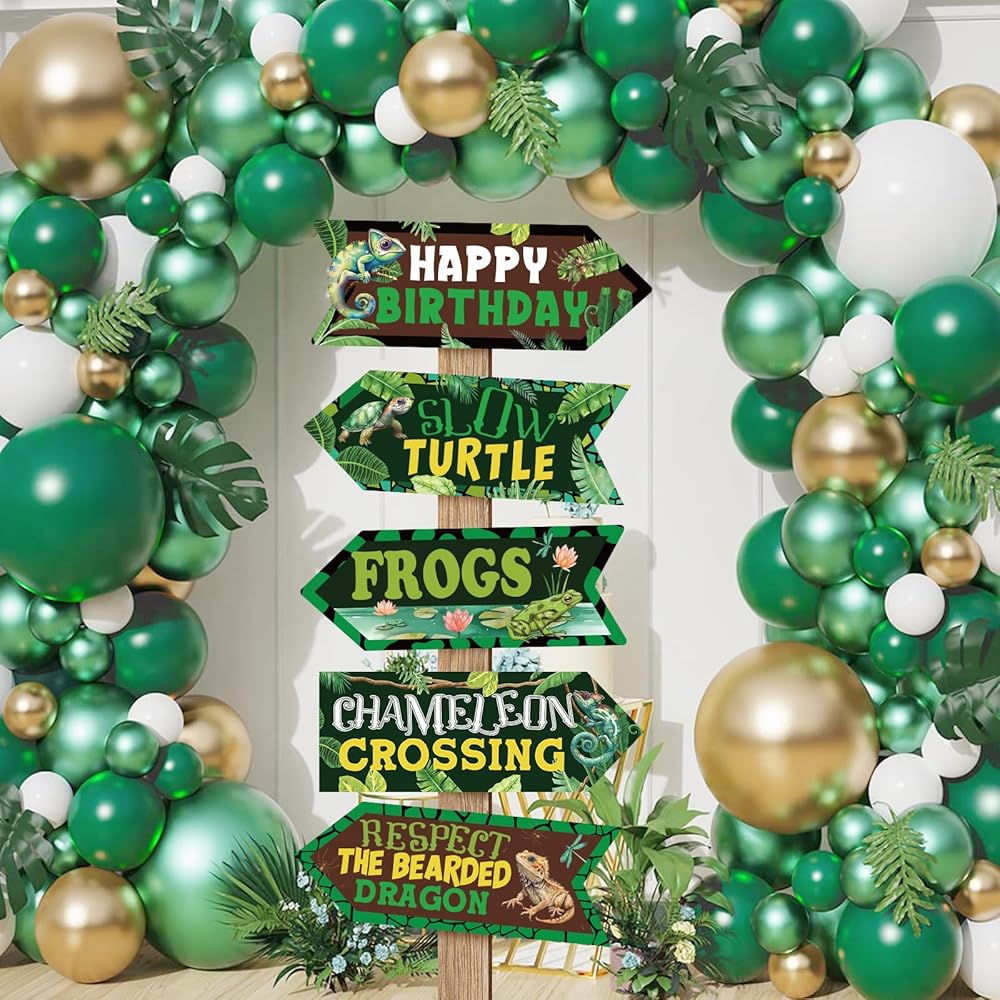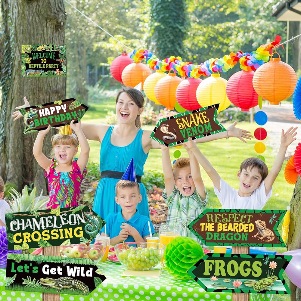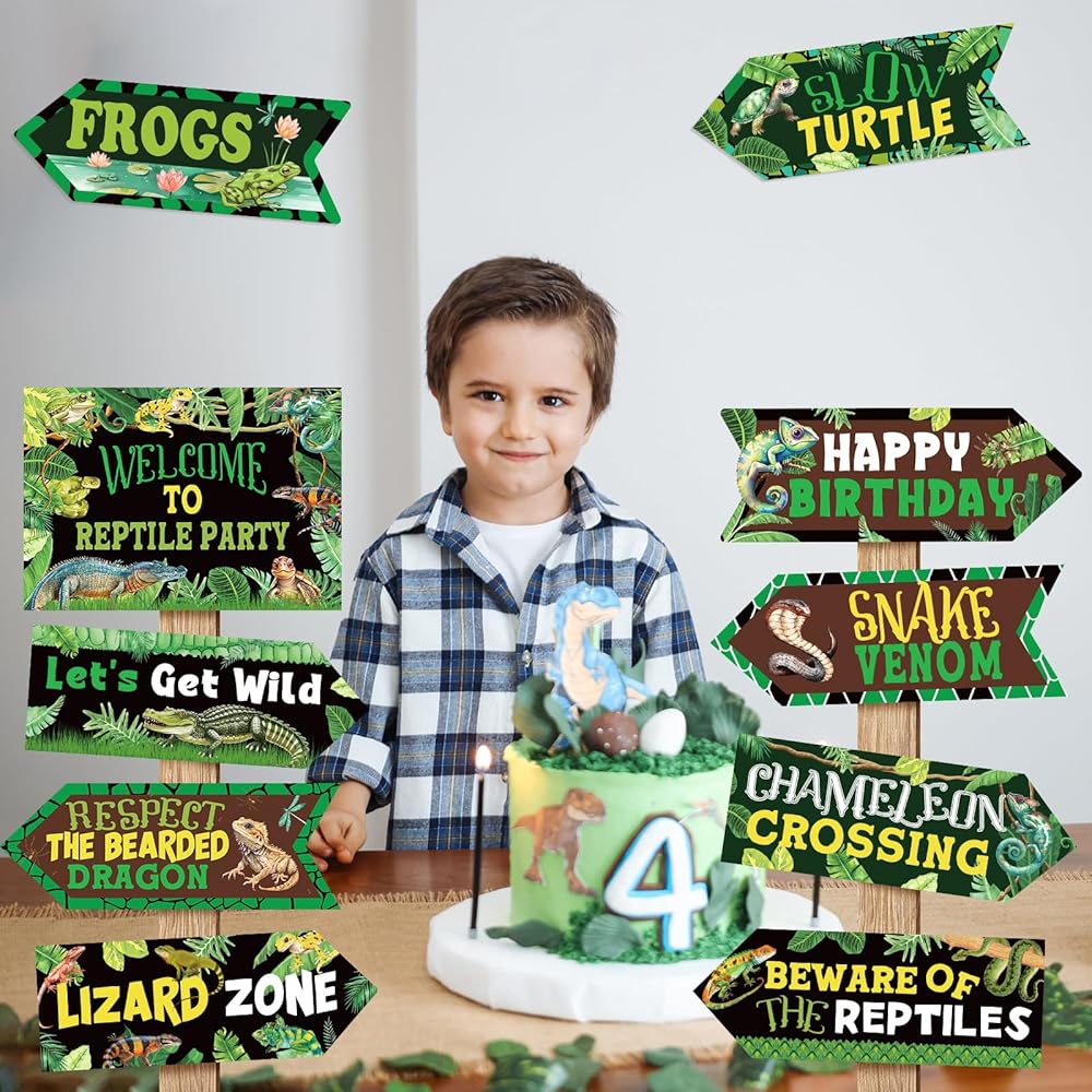 Designated area: Camping signs has a message that includes Welcome to Reptile Party, Happy birthday, Lizard Zone, Chameleon Crossing, Respect the Bearded Dragon, Slow Turtle, Frogs, Snake Venom, Let's Get Wild, Beware of the Reptiles, with realistic and clear printing that will make your party lively and attractive